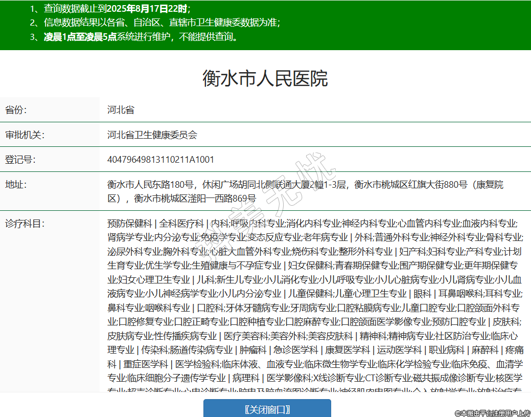 省份:河北省審批機(jī)關(guān):河北省衛(wèi)生健康委員會(huì)登記號(hào):40479649813110211A1001地址:衡水市人民東路180號(hào),休閑廣場(chǎng)胡同北側(cè)聯(lián)通大廈2幢1-3層,衡水市桃城區(qū)紅旗大街880號(hào)(康復(fù)院區(qū)),衡水市桃城區(qū)滏陽(yáng)一西路869號(hào)診療科目:預(yù)防保健科 | 全科醫(yī)療科 | 內(nèi)科;呼吸內(nèi)科專業(yè);消化內(nèi)科專業(yè);神經(jīng)內(nèi)科專業(yè);心血管內(nèi)科專業(yè);血液內(nèi)科專業(yè);腎病學(xué)專業(yè);內(nèi)分泌專業(yè);免疫學(xué)專業(yè);變態(tài)反應(yīng)專業(yè);老年病專業(yè) | 外科;普通外科專業(yè);神經(jīng)外科專業(yè);骨科專業(yè);泌尿外科專業(yè);胸外科專業(yè);心臟大血管外科專業(yè);燒傷科專業(yè);整形外科專業(yè) | 婦產(chǎn)科;婦科專業(yè);產(chǎn)科專業(yè);計(jì)劃生育專業(yè);優(yōu)生學(xué)專業(yè);生殖健康與不孕癥專業(yè) | 婦女保健科;青春期保健專業(yè);圍產(chǎn)期保健專業(yè);更年期保健專業(yè);婦女心理衛(wèi)生專業(yè) | 兒科;新生兒專業(yè);小兒消化專業(yè);小兒呼吸專業(yè);小兒心臟病專業(yè);小兒腎病專業(yè);小兒血液病專業(yè);小兒神經(jīng)病學(xué)專業(yè);小兒內(nèi)分泌專業(yè) | 兒童保健科;兒童心理衛(wèi)生專業(yè) | 眼科 | 耳鼻咽喉科;耳科專業(yè);鼻科專業(yè);咽喉科專業(yè) | 口腔科;牙體牙髓病專業(yè);牙周病專業(yè);口腔粘膜病專業(yè);兒童口腔專業(yè);口腔頜面外科專業(yè);口腔修復(fù)專業(yè);口腔正畸專業(yè);口腔種植專業(yè);口腔麻醉專業(yè);口腔頜面醫(yī)學(xué)影像專業(yè);預(yù)防口腔專業(yè) | 皮膚科;皮膚病專業(yè);性傳播疾病專業(yè) | 醫(yī)療美容科;美容外科;美容皮膚科 | 精神科;精神病專業(yè);社區(qū)防治專業(yè);臨床心理專業(yè) | 傳染科;腸道傳染病專業(yè) | 腫瘤科 | 急診醫(yī)學(xué)科 | 康復(fù)醫(yī)學(xué)科 | 運(yùn)動(dòng)醫(yī)學(xué)科 | 職業(yè)病科 | 麻醉科 | 疼痛科 | 重癥醫(yī)學(xué)科 | 醫(yī)學(xué)檢驗(yàn)科;臨床體液、血液專業(yè);臨床微生物學(xué)專業(yè);臨床化學(xué)檢驗(yàn)專業(yè);臨床免疫、血清學(xué)專業(yè);臨床細(xì)胞分子遺傳學(xué)專業(yè) | 病理科 | 醫(yī)學(xué)影像科;X線診斷專業(yè);CT診斷專業(yè);磁共振成像診斷專業(yè);核醫(yī)學(xué)專業(yè);超聲診斷專業(yè);心電診斷專業(yè);腦電及腦血流圖診斷專業(yè);神經(jīng)肌肉電圖專業(yè);介入放射學(xué)專業(yè);放射治療專業(yè) | 中醫(yī)科;內(nèi)科專業(yè);婦產(chǎn)科專業(yè);兒科專業(yè);皮膚科專業(yè);針灸科專業(yè);推拿科專業(yè);康復(fù)醫(yī)學(xué)專業(yè);預(yù)防保健科專業(yè)******級(jí)別:三級(jí)法定代表人:曹雙清主要負(fù)責(zé)人:執(zhí)業(yè)許可證有效期:2025/05/26 -至- 2029/10/26 -