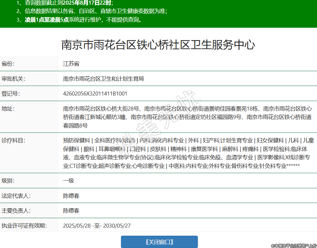 省份:江蘇省審批機(jī)關(guān):南京市雨花臺(tái)區(qū)衛(wèi)生和計(jì)劃生育局登記號(hào):42602056X32011411B1001地址:南京市雨花臺(tái)區(qū)鐵心橋大街28號(hào)、南京市雨花臺(tái)區(qū)鐵心橋街道景明佳園春景苑18棟、南京市雨花臺(tái)區(qū)鐵心橋街道春江新城沁順坊3幢、南京市雨花臺(tái)區(qū)鐵心橋街道定坊社區(qū)福園路9號(hào)、南京市雨花臺(tái)區(qū)鐵心橋街道春園路8號(hào)診療科目:預(yù)防保健科 | 全科醫(yī)療科(培訓(xùn)) | 內(nèi)科;消化內(nèi)科專業(yè) | 外科 | 婦產(chǎn)科;計(jì)劃生育專業(yè) | 婦女保健科 | 兒科 | 兒童保健科 | 眼科 | 耳鼻咽喉科 | 口腔科 | 皮膚科 | 精神科 | 康復(fù)醫(yī)學(xué)科 | 麻醉科 | 疼痛科 | 醫(yī)學(xué)檢驗(yàn)科;臨床體液、血液專業(yè);臨床微生物學(xué)專業(yè)(協(xié)議);臨床化學(xué)檢驗(yàn)專業(yè);臨床免疫、血清學(xué)專業(yè) | 醫(yī)學(xué)影像科;X線診斷專業(yè);CT診斷專業(yè);超聲診斷專業(yè);心電診斷專業(yè) | 中醫(yī)科;內(nèi)科專業(yè);外科專業(yè);骨傷科專業(yè);針灸科專業(yè)******級(jí)別:一級(jí)法定代表人:陳德春主要負(fù)責(zé)人:陳德春執(zhí)業(yè)許可證有效期:2025/05/28 -至- 2030/05/27 -
