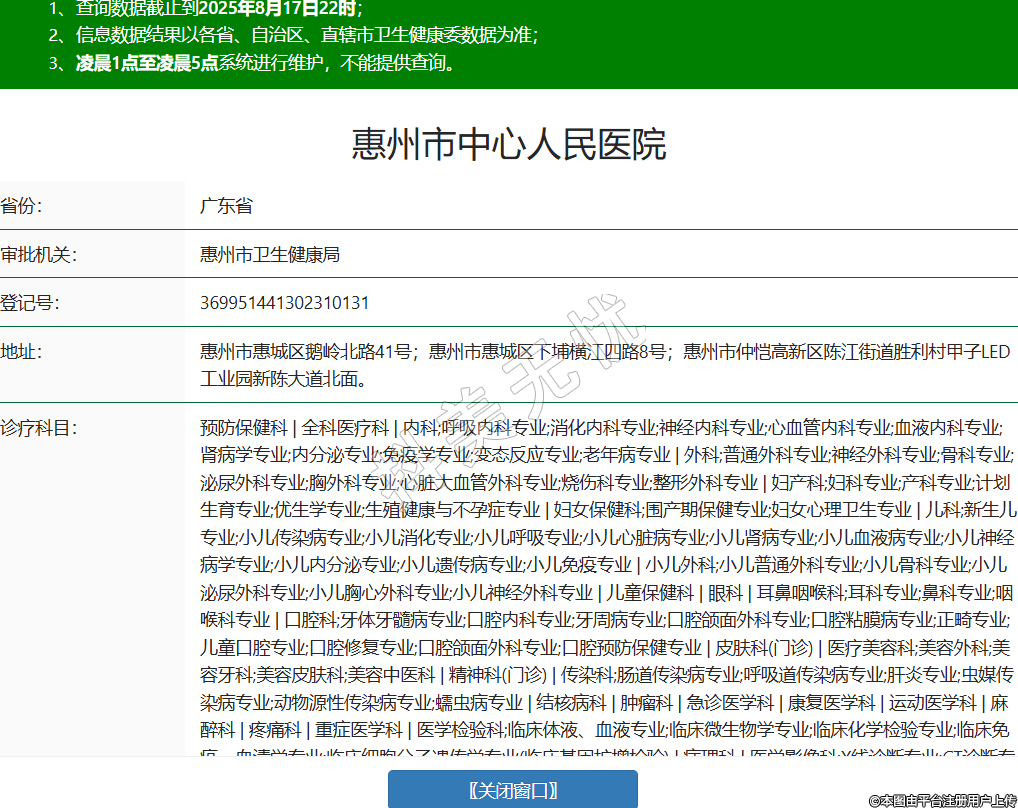 省份:廣東省審批機關:惠州市衛(wèi)生健康局登記號:369951441302310131地址:惠州市惠城區(qū)鵝嶺北路41號;惠州市惠城區(qū)下埔橫江四路8號;惠州市仲愷高新區(qū)陳江街道勝利村甲子LED工業(yè)園新陳大道北面。診療科目:預防保健科 | 全科醫(yī)療科 | 內科;呼吸內科專業(yè);消化內科專業(yè);神經(jīng)內科專業(yè);心血管內科專業(yè);血液內科專業(yè);腎病學專業(yè);內分泌專業(yè);免疫學專業(yè);變態(tài)反應專業(yè);老年病專業(yè) | 外科;普通外科專業(yè);神經(jīng)外科專業(yè);骨科專業(yè);泌尿外科專業(yè);胸外科專業(yè);心臟大血管外科專業(yè);燒傷科專業(yè);整形外科專業(yè) | 婦產(chǎn)科;婦科專業(yè);產(chǎn)科專業(yè);計劃生育專業(yè);優(yōu)生學專業(yè);生殖健康與不孕癥專業(yè) | 婦女保健科;圍產(chǎn)期保健專業(yè);婦女心理衛(wèi)生專業(yè) | 兒科;新生兒專業(yè);小兒傳染病專業(yè);小兒消化專業(yè);小兒呼吸專業(yè);小兒心臟病專業(yè);小兒腎病專業(yè);小兒血液病專業(yè);小兒神經(jīng)病學專業(yè);小兒內分泌專業(yè);小兒遺傳病專業(yè);小兒免疫專業(yè) | 小兒外科;小兒普通外科專業(yè);小兒骨科專業(yè);小兒泌尿外科專業(yè);小兒胸心外科專業(yè);小兒神經(jīng)外科專業(yè) | 兒童保健科 | 眼科 | 耳鼻咽喉科;耳科專業(yè);鼻科專業(yè);咽喉科專業(yè) | 口腔科;牙體牙髓病專業(yè);口腔內科專業(yè);牙周病專業(yè);口腔頜面外科專業(yè);口腔粘膜病專業(yè);正畸專業(yè);兒童口腔專業(yè);口腔修復專業(yè);口腔頜面外科專業(yè);口腔預防保健專業(yè) | 皮膚科(門診) | 醫(yī)療美容科;美容外科;美容牙科;美容皮膚科;美容中醫(yī)科 | 精神科(門診) | 傳染科;腸道傳染病專業(yè);呼吸道傳染病專業(yè);肝炎專業(yè);蟲媒傳染病專業(yè);動物源性傳染病專業(yè);蠕蟲病專業(yè) | 結核病科 | 腫瘤科 | 急診醫(yī)學科 | 康復醫(yī)學科 | 運動醫(yī)學科 | 麻醉科 | 疼痛科 | 重癥醫(yī)學科 | 醫(yī)學檢驗科;臨床體液、血液專業(yè);臨床微生物學專業(yè);臨床化學檢驗專業(yè);臨床免疫、血清學專業(yè);臨床細胞分子遺傳學專業(yè)(臨床基因擴增檢驗) | 病理科 | 醫(yī)學影像科;X線診斷專業(yè);CT診斷專業(yè);磁共振成像診斷專業(yè);核醫(yī)學專業(yè);超聲診斷專業(yè);心電診斷專業(yè);腦電及腦血流圖診斷專業(yè);神經(jīng)肌肉電圖專業(yè);介入放射學專業(yè);放射治療專業(yè) | 中醫(yī)科 | 中西醫(yī)結合科******級別:三級法定代表人:紀燕琴主要負責人:紀燕琴執(zhí)業(yè)許可證有效期:2024/03/20 -至- 2029/12/04 -