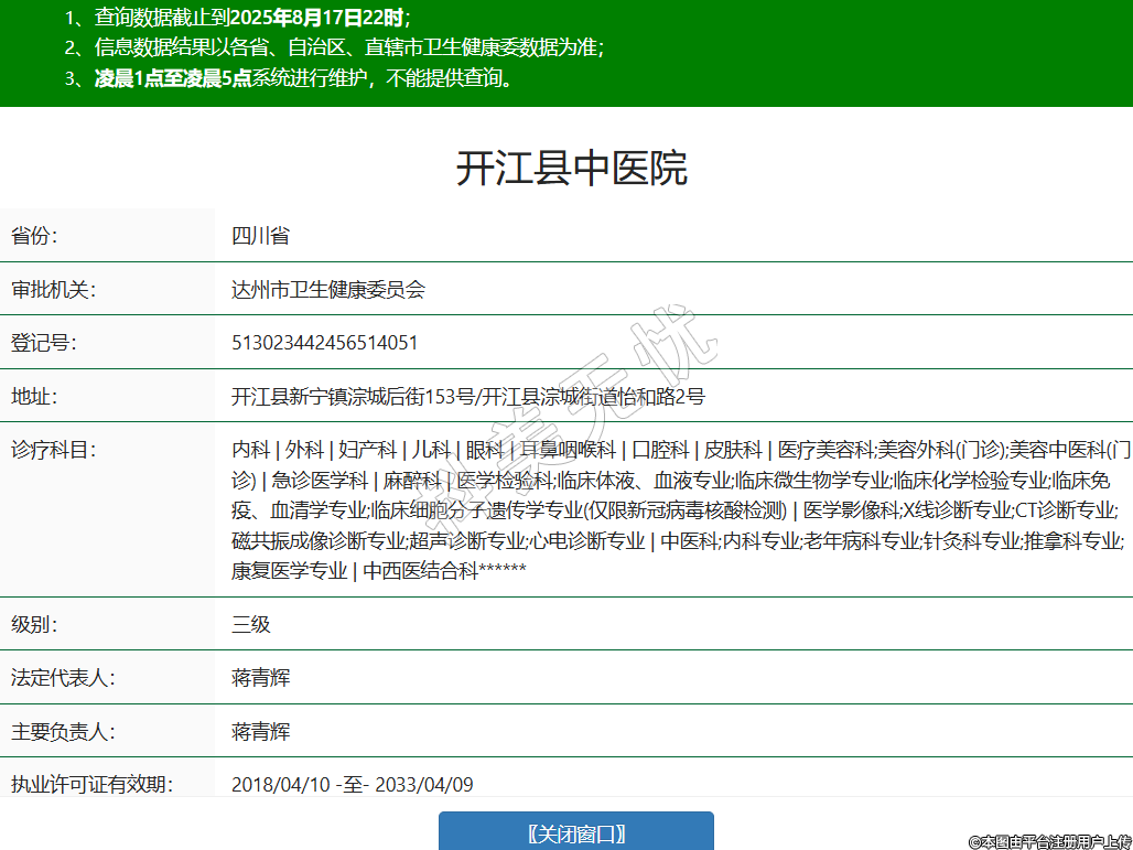 省份:四川省審批機關:達州市衛(wèi)生健康委員會登記號:513023442456514051地址:開江縣新寧鎮(zhèn)淙城后街153號/開江縣淙城街道怡和路2號診療科目:內科 | 外科 | 婦產科 | 兒科 | 眼科 | 耳鼻咽喉科 | 口腔科 | 皮膚科 | 醫(yī)療美容科;美容外科(門診);美容中醫(yī)科(門診) | 急診醫(yī)學科 | 麻醉科 | 醫(yī)學檢驗科;臨床體液、血液專業(yè);臨床微生物學專業(yè);臨床化學檢驗專業(yè);臨床免疫、血清學專業(yè);臨床細胞分子遺傳學專業(yè)(僅限新冠病毒核酸檢測) | 醫(yī)學影像科;X線診斷專業(yè);CT診斷專業(yè);磁共振成像診斷專業(yè);超聲診斷專業(yè);心電診斷專業(yè) | 中醫(yī)科;內科專業(yè);老年病科專業(yè);針灸科專業(yè);推拿科專業(yè);康復醫(yī)學專業(yè) | 中西醫(yī)結合科******級別:三級法定代表人:蔣青輝主要負責人:蔣青輝執(zhí)業(yè)許可證有效期:2018/04/10 -至- 2033/04/09 -