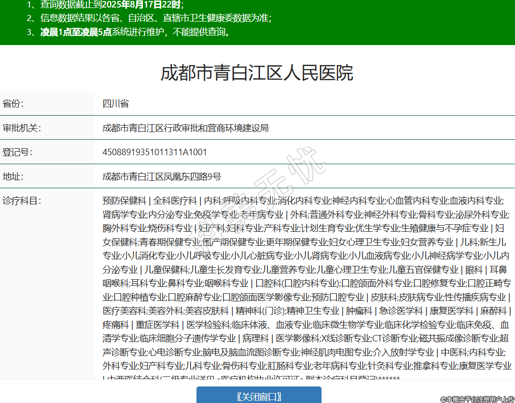 省份:四川省審批機(jī)關(guān):成都市青白江區(qū)行政審批和營(yíng)商環(huán)境建設(shè)局登記號(hào):45088919351011311A1001地址:成都市青白江區(qū)鳳凰東四路9號(hào)診療科目:預(yù)防保健科 | 全科醫(yī)療科 | 內(nèi)科;呼吸內(nèi)科專業(yè);消化內(nèi)科專業(yè);神經(jīng)內(nèi)科專業(yè);心血管內(nèi)科專業(yè);血液內(nèi)科專業(yè);腎病學(xué)專業(yè);內(nèi)分泌專業(yè);免疫學(xué)專業(yè);老年病專業(yè) | 外科;普通外科專業(yè);神經(jīng)外科專業(yè);骨科專業(yè);泌尿外科專業(yè);胸外科專業(yè);燒傷科專業(yè) | 婦產(chǎn)科;婦科專業(yè);產(chǎn)科專業(yè);計(jì)劃生育專業(yè);優(yōu)生學(xué)專業(yè);生殖健康與不孕癥專業(yè) | 婦女保健科;青春期保健專業(yè);圍產(chǎn)期保健專業(yè);更年期保健專業(yè);婦女心理衛(wèi)生專業(yè);婦女營(yíng)養(yǎng)專業(yè) | 兒科;新生兒專業(yè);小兒消化專業(yè);小兒呼吸專業(yè);小兒心臟病專業(yè);小兒腎病專業(yè);小兒血液病專業(yè);小兒神經(jīng)病學(xué)專業(yè);小兒內(nèi)分泌專業(yè) | 兒童保健科;兒童生長(zhǎng)發(fā)育專業(yè);兒童營(yíng)養(yǎng)專業(yè);兒童心理衛(wèi)生專業(yè);兒童五官保健專業(yè) | 眼科 | 耳鼻咽喉科;耳科專業(yè);鼻科專業(yè);咽喉科專業(yè) | 口腔科(口腔內(nèi)科專業(yè));口腔頜面外科專業(yè);口腔修復(fù)專業(yè);口腔正畸專業(yè);口腔種植專業(yè);口腔麻醉專業(yè);口腔頜面醫(yī)學(xué)影像專業(yè);預(yù)防口腔專業(yè) | 皮膚科;皮膚病專業(yè);性傳播疾病專業(yè) | 醫(yī)療美容科;美容外科;美容皮膚科 | 精神科(門診);精神衛(wèi)生專業(yè) | 腫瘤科 | 急診醫(yī)學(xué)科 | 康復(fù)醫(yī)學(xué)科 | 麻醉科 | 疼痛科 | 重癥醫(yī)學(xué)科 | 醫(yī)學(xué)檢驗(yàn)科;臨床體液、血液專業(yè);臨床微生物學(xué)專業(yè);臨床化學(xué)檢驗(yàn)專業(yè);臨床免疫、血清學(xué)專業(yè);臨床細(xì)胞分子遺傳學(xué)專業(yè) | 病理科 | 醫(yī)學(xué)影像科;X線診斷專業(yè);CT診斷專業(yè);磁共振成像診斷專業(yè);超聲診斷專業(yè);心電診斷專業(yè);腦電及腦血流圖診斷專業(yè);神經(jīng)肌肉電圖專業(yè);介入放射學(xué)專業(yè) | 中醫(yī)科;內(nèi)科專業(yè);外科專業(yè);婦產(chǎn)科專業(yè);兒科專業(yè);骨傷科專業(yè);肛腸科專業(yè);老年病科專業(yè);針灸科專業(yè);推拿科專業(yè);康復(fù)醫(yī)學(xué)專業(yè) | 中西醫(yī)結(jié)合科(二級(jí)專業(yè)詳見<醫(yī)療機(jī)構(gòu)執(zhí)業(yè)許可證>副本診療科目登記)******級(jí)別:三級(jí)法定代表人:張文勇主要負(fù)責(zé)人:執(zhí)業(yè)許可證有效期:2013/12/13 -至- 2028/12/12 -