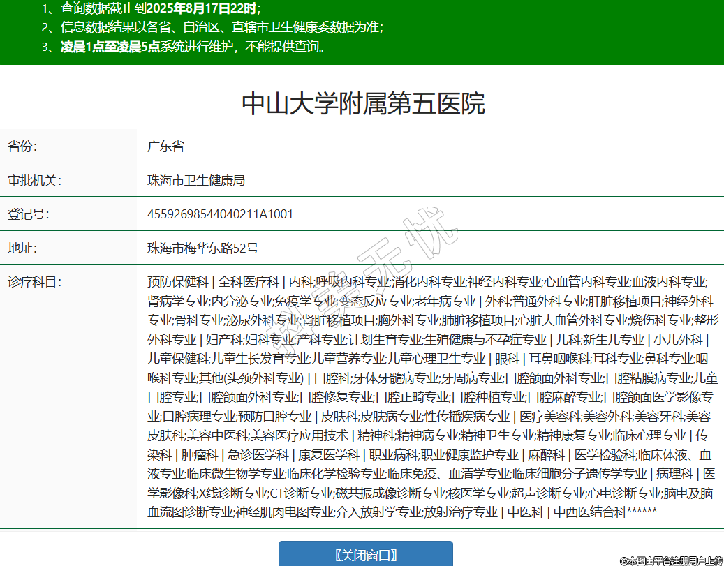 省份:廣東省審批機關(guān):珠海市衛(wèi)生健康局登記號:45592698544040211A1001地址:珠海市梅華東路52號診療科目:預(yù)防保健科 | 全科醫(yī)療科 | 內(nèi)科;呼吸內(nèi)科專業(yè);消化內(nèi)科專業(yè);神經(jīng)內(nèi)科專業(yè);心血管內(nèi)科專業(yè);血液內(nèi)科專業(yè);腎病學(xué)專業(yè);內(nèi)分泌專業(yè);免疫學(xué)專業(yè);變態(tài)反應(yīng)專業(yè);老年病專業(yè) | 外科;普通外科專業(yè);肝臟移植項目;神經(jīng)外科專業(yè);骨科專業(yè);泌尿外科專業(yè);腎臟移植項目;胸外科專業(yè);肺臟移植項目;心臟大血管外科專業(yè);燒傷科專業(yè);整形外科專業(yè) | 婦產(chǎn)科;婦科專業(yè);產(chǎn)科專業(yè);計劃生育專業(yè);生殖健康與不孕癥專業(yè) | 兒科;新生兒專業(yè) | 小兒外科 | 兒童保健科;兒童生長發(fā)育專業(yè);兒童營養(yǎng)專業(yè);兒童心理衛(wèi)生專業(yè) | 眼科 | 耳鼻咽喉科;耳科專業(yè);鼻科專業(yè);咽喉科專業(yè);其他(頭頸外科專業(yè)) | 口腔科;牙體牙髓病專業(yè);牙周病專業(yè);口腔頜面外科專業(yè);口腔粘膜病專業(yè);兒童口腔專業(yè);口腔頜面外科專業(yè);口腔修復(fù)專業(yè);口腔正畸專業(yè);口腔種植專業(yè);口腔麻醉專業(yè);口腔頜面醫(yī)學(xué)影像專業(yè);口腔病理專業(yè);預(yù)防口腔專業(yè) | 皮膚科;皮膚病專業(yè);性傳播疾病專業(yè) | 醫(yī)療美容科;美容外科;美容牙科;美容皮膚科;美容中醫(yī)科;美容醫(yī)療應(yīng)用技術(shù) | 精神科;精神病專業(yè);精神衛(wèi)生專業(yè);精神康復(fù)專業(yè);臨床心理專業(yè) | 傳染科 | 腫瘤科 | 急診醫(yī)學(xué)科 | 康復(fù)醫(yī)學(xué)科 | 職業(yè)病科;職業(yè)健康監(jiān)護專業(yè) | 麻醉科 | 醫(yī)學(xué)檢驗科;臨床體液、血液專業(yè);臨床微生物學(xué)專業(yè);臨床化學(xué)檢驗專業(yè);臨床免疫、血清學(xué)專業(yè);臨床細(xì)胞分子遺傳學(xué)專業(yè) | 病理科 | 醫(yī)學(xué)影像科;X線診斷專業(yè);CT診斷專業(yè);磁共振成像診斷專業(yè);核醫(yī)學(xué)專業(yè);超聲診斷專業(yè);心電診斷專業(yè);腦電及腦血流圖診斷專業(yè);神經(jīng)肌肉電圖專業(yè);介入放射學(xué)專業(yè);放射治療專業(yè) | 中醫(yī)科 | 中西醫(yī)結(jié)合科******級別:三級法定代表人:林天歆主要負(fù)責(zé)人:林天歆執(zhí)業(yè)許可證有效期:2025/06/10 -至- 2032/04/17 -