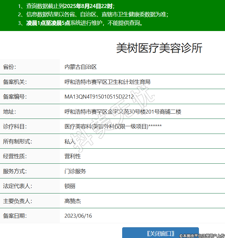 省份:內(nèi)蒙古自治區(qū)備案機關(guān):呼和浩特市賽罕區(qū)衛(wèi)生和計劃生育局備案編號:MA13QN4T915010515D2212地址:呼和浩特市賽罕區(qū)金宇文苑30號樓201號商鋪二樓診療科目:醫(yī)療美容科(美容外科僅限一級項目)******所有制形式:私人經(jīng)營性質(zhì):營利性服務(wù)方式:門診服務(wù)法定代表人:鎖麗主要負責(zé)人:高贊杰備案日期:2023/06/16 -