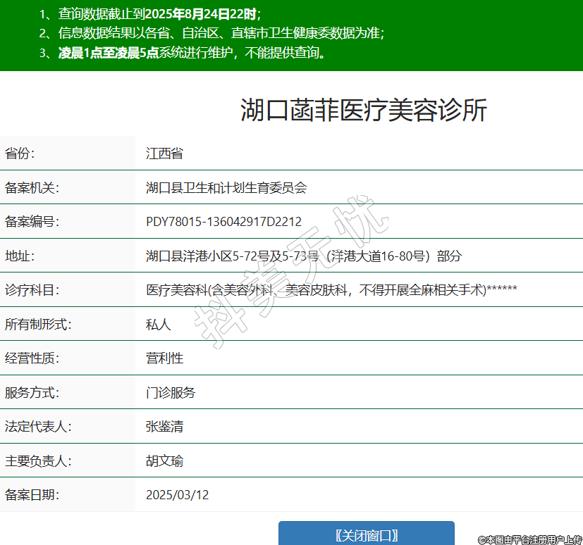 省份:江西省備案機關:湖口縣衛(wèi)生和計劃生育委員會備案編號:PDY78015-136042917D2212地址:湖口縣洋港小區(qū)5-72號及5-73號(洋港大道16-80號)部分診療科目:醫(yī)療美容科(含美容外科、美容皮膚科,不得開展全麻相關手術)******所有制形式:私人經(jīng)營性質(zhì):營利性服務方式:門診服務法定代表人:張鑒清主要負責人:胡文瑜備案日期:2025/03/12 -