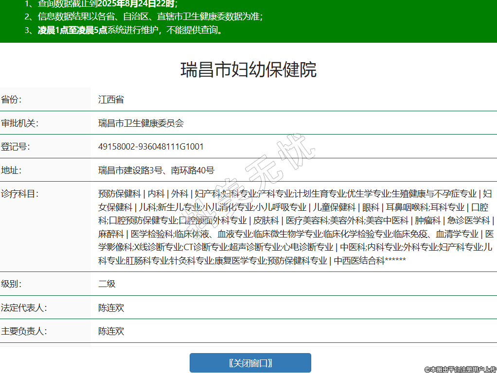 瑞昌市婦幼保健院,診療科目:預防保健科 | 內(nèi)科 | 外科 | 婦產(chǎn)科 | 婦女保健科 | 兒科;新生兒專業(yè);小兒消化專業(yè);小兒呼吸專業(yè) | 兒童保健科 | 眼科 | 耳鼻咽喉科| 口腔科 | 皮膚科 | 醫(yī)療美容科;美容外科;美容中醫(yī)科 | 腫瘤科 | 急診醫(yī)學科 | 麻醉科 | 醫(yī)學檢驗科 | 醫(yī)學影像科 | 中醫(yī)科;內(nèi)科專業(yè);外科專業(yè);婦產(chǎn)科專業(yè);兒科專業(yè);肛腸科專業(yè);針灸科專業(yè);康復醫(yī)學專業(yè);預防保健科專業(yè) | 中西醫(yī)結(jié)合科******
