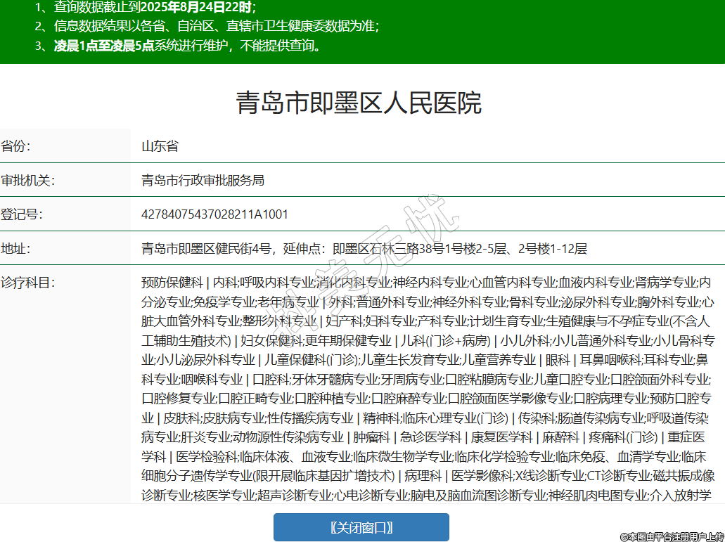省份:山東省審批機關:青島市行政審批服務局登記號:42784075437028211A1001地址:青島市即墨區(qū)健民街4號,延伸點:即墨區(qū)石林三路38號1號樓2-5層、2號樓1-12層診療科目:預防保健科 | 內科;呼吸內科專業(yè);消化內科專業(yè);神經內科專業(yè);心血管內科專業(yè);血液內科專業(yè);腎病學專業(yè);內分泌專業(yè);免疫學專業(yè);老年病專業(yè) | 外科;普通外科專業(yè);神經外科專業(yè);骨科專業(yè);泌尿外科專業(yè);胸外科專業(yè);心臟大血管外科專業(yè);整形外科專業(yè) | 婦產科;婦科專業(yè);產科專業(yè);計劃生育專業(yè);生殖健康與不孕癥專業(yè)(不含人工輔助生殖技術) | 婦女保健科;更年期保健專業(yè) | 兒科(門診+病房) | 小兒外科;小兒普通外科專業(yè);小兒骨科專業(yè);小兒泌尿外科專業(yè) | 兒童保健科(門診);兒童生長發(fā)育專業(yè);兒童營養(yǎng)專業(yè) | 眼科 | 耳鼻咽喉科;耳科專業(yè);鼻科專業(yè);咽喉科專業(yè) | 口腔科;牙體牙髓病專業(yè);牙周病專業(yè);口腔粘膜病專業(yè);兒童口腔專業(yè);口腔頜面外科專業(yè);口腔修復專業(yè);口腔正畸專業(yè);口腔種植專業(yè);口腔麻醉專業(yè);口腔頜面醫(yī)學影像專業(yè);口腔病理專業(yè);預防口腔專業(yè) | 皮膚科;皮膚病專業(yè);性傳播疾病專業(yè) | 精神科;臨床心理專業(yè)(門診) | 傳染科;腸道傳染病專業(yè);呼吸道傳染病專業(yè);肝炎專業(yè);動物源性傳染病專業(yè) | 腫瘤科 | 急診醫(yī)學科 | 康復醫(yī)學科 | 麻醉科 | 疼痛科(門診) | 重癥醫(yī)學科 | 醫(yī)學檢驗科;臨床體液、血液專業(yè);臨床微生物學專業(yè);臨床化學檢驗專業(yè);臨床免疫、血清學專業(yè);臨床細胞分子遺傳學專業(yè)(限開展臨床基因擴增技術) | 病理科 | 醫(yī)學影像科;X線診斷專業(yè);CT診斷專業(yè);磁共振成像診斷專業(yè);核醫(yī)學專業(yè);超聲診斷專業(yè);心電診斷專業(yè);腦電及腦血流圖診斷專業(yè);神經肌肉電圖專業(yè);介入放射學專業(yè);放射治療專業(yè) | 中醫(yī)科;內科專業(yè);外科專業(yè);婦產科專業(yè);骨傷科專業(yè);肛腸科專業(yè);針灸科專業(yè);推拿科專業(yè);康復醫(yī)學專業(yè)******級別:三級法定代表人:姜尊平主要負責人:宋啟京執(zhí)業(yè)許可證有效期:2018/09/19 -至- 2031/06/23 -