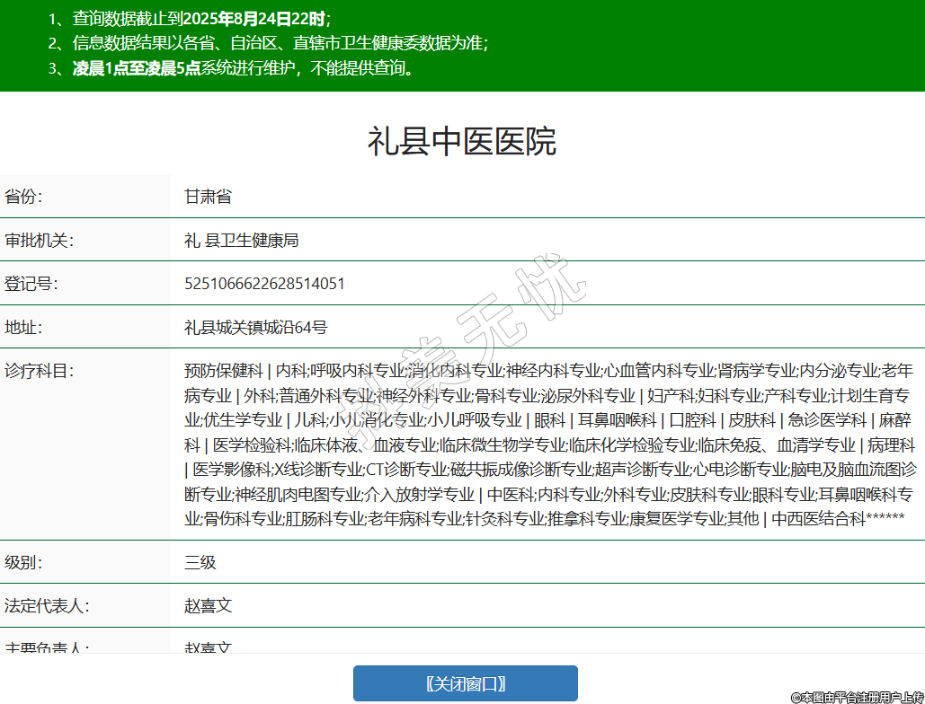 省份:甘肅省審批機(jī)關(guān):禮 縣衛(wèi)生健康局登記號(hào):5251066622628514051地址:禮縣城關(guān)鎮(zhèn)城沿64號(hào)診療科目:預(yù)防保健科 | 內(nèi)科;呼吸內(nèi)科專業(yè);消化內(nèi)科專業(yè);神經(jīng)內(nèi)科專業(yè);心血管內(nèi)科專業(yè);腎病學(xué)專業(yè);內(nèi)分泌專業(yè);老年病專業(yè) | 外科;普通外科專業(yè);神經(jīng)外科專業(yè);骨科專業(yè);泌尿外科專業(yè) | 婦產(chǎn)科;婦科專業(yè);產(chǎn)科專業(yè);計(jì)劃生育專業(yè);優(yōu)生學(xué)專業(yè) | 兒科;小兒消化專業(yè);小兒呼吸專業(yè) | 眼科 | 耳鼻咽喉科 | 口腔科 | 皮膚科 | 急診醫(yī)學(xué)科 | 麻醉科 | 醫(yī)學(xué)檢驗(yàn)科;臨床體液、血液專業(yè);臨床微生物學(xué)專業(yè);臨床化學(xué)檢驗(yàn)專業(yè);臨床免疫、血清學(xué)專業(yè) | 病理科 | 醫(yī)學(xué)影像科;X線診斷專業(yè);CT診斷專業(yè);磁共振成像診斷專業(yè);超聲診斷專業(yè);心電診斷專業(yè);腦電及腦血流圖診斷專業(yè);神經(jīng)肌肉電圖專業(yè);介入放射學(xué)專業(yè) | 中醫(yī)科;內(nèi)科專業(yè);外科專業(yè);皮膚科專業(yè);眼科專業(yè);耳鼻咽喉科專業(yè);骨傷科專業(yè);肛腸科專業(yè);老年病科專業(yè);針灸科專業(yè);推拿科專業(yè);康復(fù)醫(yī)學(xué)專業(yè);其他 | 中西醫(yī)結(jié)合科******級(jí)別:三級(jí)法定代表人:趙喜文主要負(fù)責(zé)人:趙喜文執(zhí)業(yè)許可證有效期:2021/04/02 -至- 2036/04/01 -