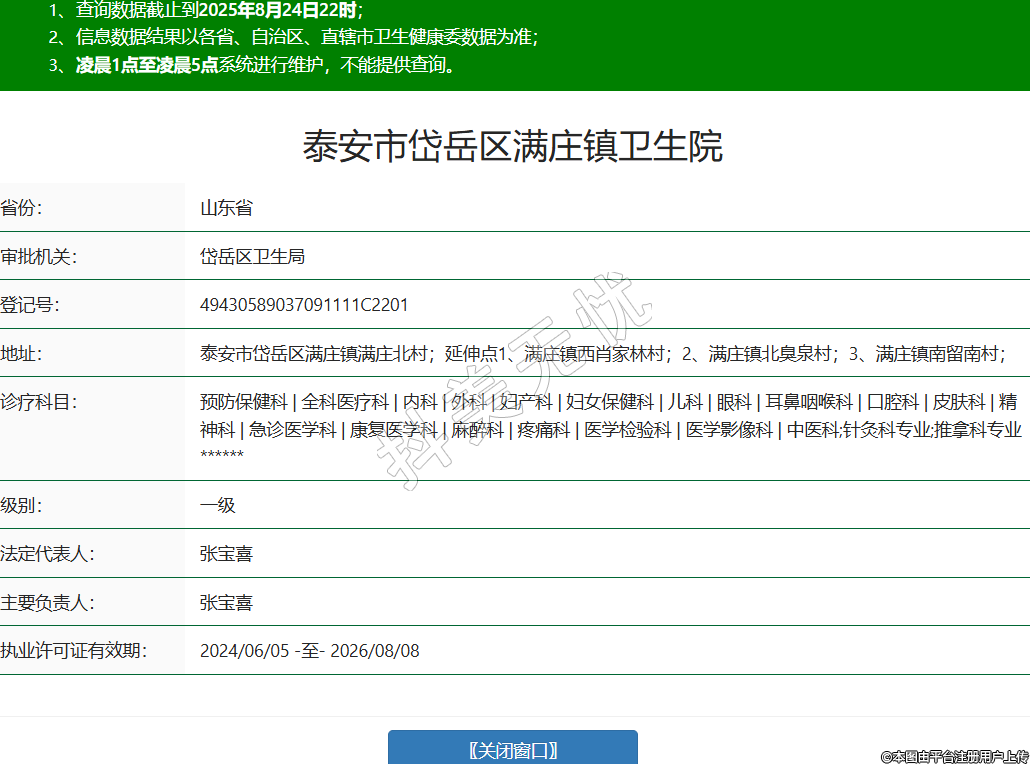 省份:山東省審批機(jī)關(guān):岱岳區(qū)衛(wèi)生局登記號(hào):49430589037091111C2201地址:泰安市岱岳區(qū)滿莊鎮(zhèn)滿莊北村;延伸點(diǎn)1、滿莊鎮(zhèn)西肖家林村;2、滿莊鎮(zhèn)北臭泉村;3、滿莊鎮(zhèn)南留南村;診療科目:預(yù)防保健科 | 全科醫(yī)療科 | 內(nèi)科 | 外科 | 婦產(chǎn)科 | 婦女保健科 | 兒科 | 眼科 | 耳鼻咽喉科 | 口腔科 | 皮膚科 | 精神科 | 急診醫(yī)學(xué)科 | 康復(fù)醫(yī)學(xué)科 | 麻醉科 | 疼痛科 | 醫(yī)學(xué)檢驗(yàn)科 | 醫(yī)學(xué)影像科 | 中醫(yī)科;針灸科專業(yè);推拿科專業(yè)******級(jí)別:一級(jí)法定代表人:張寶喜主要負(fù)責(zé)人:張寶喜執(zhí)業(yè)許可證有效期:2024/06/05 -至- 2026/08/08 -