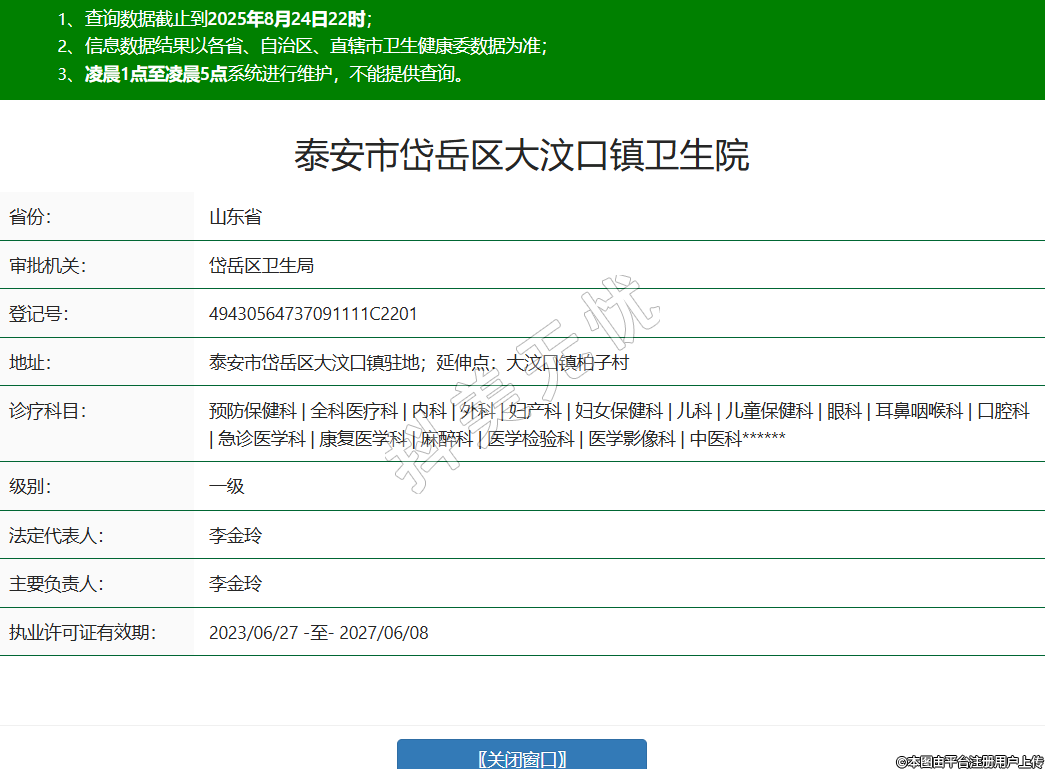 省份:山東省審批機關:岱岳區(qū)衛(wèi)生局登記號:49430564737091111C2201地址:泰安市岱岳區(qū)大汶口鎮(zhèn)駐地;延伸點:大汶口鎮(zhèn)柏子村診療科目:預防保健科 | 全科醫(yī)療科 | 內(nèi)科 | 外科 | 婦產(chǎn)科 | 婦女保健科 | 兒科 | 兒童保健科 | 眼科 | 耳鼻咽喉科 | 口腔科 | 急診醫(yī)學科 | 康復醫(yī)學科 | 麻醉科 | 醫(yī)學檢驗科 | 醫(yī)學影像科 | 中醫(yī)科******級別:一級法定代表人:李金玲主要負責人:李金玲執(zhí)業(yè)許可證有效期:2023/06/27 -至- 2027/06/08 -