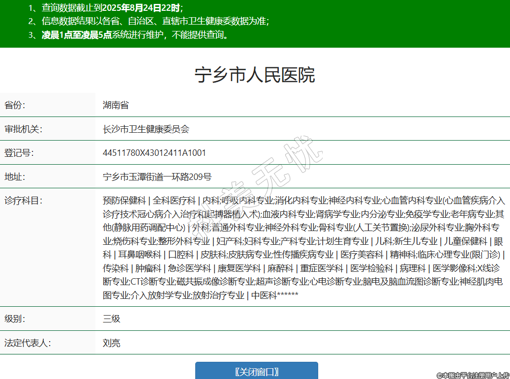 省份:湖南省審批機(jī)關(guān):長(zhǎng)沙市衛(wèi)生健康委員會(huì)登記號(hào):44511780X43012411A1001地址:寧鄉(xiāng)市玉潭街道一環(huán)路209號(hào)診療科目:預(yù)防保健科 | 全科醫(yī)療科 | 內(nèi)科;呼吸內(nèi)科專業(yè);消化內(nèi)科專業(yè);神經(jīng)內(nèi)科專業(yè);心血管內(nèi)科專業(yè)(心血管疾病介入診療技術(shù)冠心病介入治療和起搏器植入術(shù));血液內(nèi)科專業(yè);腎病學(xué)專業(yè);內(nèi)分泌專業(yè);免疫學(xué)專業(yè);老年病專業(yè);其他(靜脈用藥調(diào)配中心) | 外科;普通外科專業(yè);神經(jīng)外科專業(yè);骨科專業(yè)(人工關(guān)節(jié)置換);泌尿外科專業(yè);胸外科專業(yè);燒傷科專業(yè);整形外科專業(yè) | 婦產(chǎn)科;婦科專業(yè);產(chǎn)科專業(yè);計(jì)劃生育專業(yè) | 兒科;新生兒專業(yè) | 兒童保健科 | 眼科 | 耳鼻咽喉科 | 口腔科 | 皮膚科;皮膚病專業(yè);性傳播疾病專業(yè) | 醫(yī)療美容科 | 精神科;臨床心理專業(yè)(限門診) | 傳染科 | 腫瘤科 | 急診醫(yī)學(xué)科 | 康復(fù)醫(yī)學(xué)科 | 麻醉科 | 重癥醫(yī)學(xué)科 | 醫(yī)學(xué)檢驗(yàn)科 | 病理科 | 醫(yī)學(xué)影像科;X線診斷專業(yè);CT診斷專業(yè);磁共振成像診斷專業(yè);超聲診斷專業(yè);心電診斷專業(yè);腦電及腦血流圖診斷專業(yè);神經(jīng)肌肉電圖專業(yè);介入放射學(xué)專業(yè);放射治療專業(yè) | 中醫(yī)科******級(jí)別:三級(jí)法定代表人:劉亮主要負(fù)責(zé)人:劉亮執(zhí)業(yè)許可證有效期:2024/04/02 -至- 2029/04/01 -