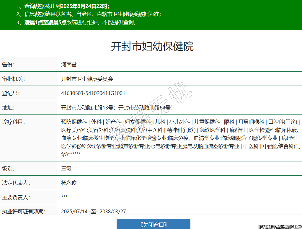 省份:河南省審批機關(guān):開封市衛(wèi)生健康委員會登記號:41630503-541020411G1001地址:開封市勞動路北段13號;開封市勞動路北段64號診療科目:預防保健科 | 外科 | 婦產(chǎn)科 | 婦女保健科 | 兒科 | 小兒外科 | 兒童保健科 | 眼科 | 耳鼻咽喉科 | 口腔科(門診) | 醫(yī)療美容科;美容外科;美容皮膚科;美容中醫(yī)科 | 精神科(門診) | 急診醫(yī)學科 | 麻醉科 | 醫(yī)學檢驗科;臨床體液、血液專業(yè);臨床微生物學專業(yè);臨床化學檢驗專業(yè);臨床免疫、血清學專業(yè);臨床細胞分子遺傳學專業(yè) | 病理科 | 醫(yī)學影像科;X線診斷專業(yè);超聲診斷專業(yè);心電診斷專業(yè);腦電及腦血流圖診斷專業(yè) | 中醫(yī)科 | 中西醫(yī)結(jié)合科(門診)******級別:三級法定代表人:楊永俊主要負責人:***執(zhí)業(yè)許可證有效期:2025/07/14 -至- 2038/03/27 -