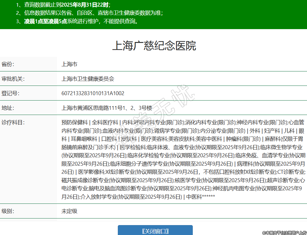 省份:上海市審批機(jī)關(guān):上海市衛(wèi)生健康委員會(huì)登記號(hào):60721332831010131A1002地址:上海市黃浦區(qū)思南路111號(hào)1、2、3號(hào)樓診療科目:預(yù)防保健科 | 全科醫(yī)療科 | 內(nèi)科;呼吸內(nèi)科專業(yè)(限門診);消化內(nèi)科專業(yè)(限門診);神經(jīng)內(nèi)科專業(yè)(限門診);心血管內(nèi)科專業(yè)(限門診);血液內(nèi)科專業(yè)(限門診);腎病學(xué)專業(yè)(限門診);內(nèi)分泌專業(yè)(限門診) | 外科 | 婦產(chǎn)科 | 兒科 | 眼科 | 耳鼻咽喉科 | 口腔科 | 皮膚科 | 醫(yī)療美容科;美容皮膚科;美容中醫(yī)科 | 腫瘤科(限門診) | 麻醉科(僅限于胃腸鏡前麻醉及門診手術(shù)) | 醫(yī)學(xué)檢驗(yàn)科;臨床體液、血液專業(yè)(協(xié)議期限至2025年9月26日);臨床微生物學(xué)專業(yè)(協(xié)議期限至2025年9月26日);臨床化學(xué)檢驗(yàn)專業(yè)(協(xié)議期限至2025年9月26日);臨床免疫、血清學(xué)專業(yè)(協(xié)議期限至2025年9月26日);臨床細(xì)胞分子遺傳學(xué)專業(yè)(協(xié)議期限至2025年9月26日) | 病理科(協(xié)議期限至2025年9月26日) | 醫(yī)學(xué)影像科;X線診斷專業(yè)(協(xié)議期限至2025年9月26日,不包括口腔科放射X線診斷專業(yè));CT診斷專業(yè);磁共振成像診斷專業(yè)(協(xié)議期限至2025年9月26日);核醫(yī)學(xué)專業(yè)(協(xié)議期限至2025年9月26日);超聲診斷專業(yè);心電診斷專業(yè);腦電及腦血流圖診斷專業(yè)(協(xié)議期限至2025年9月26日);神經(jīng)肌肉電圖專業(yè)(協(xié)議期限至2025年9月26日);介入放射學(xué)專業(yè)(協(xié)議期限至2025年9月26日) | 中醫(yī)科******級(jí)別:未定級(jí)法定代表人:俞郁萍主要負(fù)責(zé)人:張晨莉執(zhí)業(yè)許可證有效期:2024/04/09 -至- 2029/04/08 -