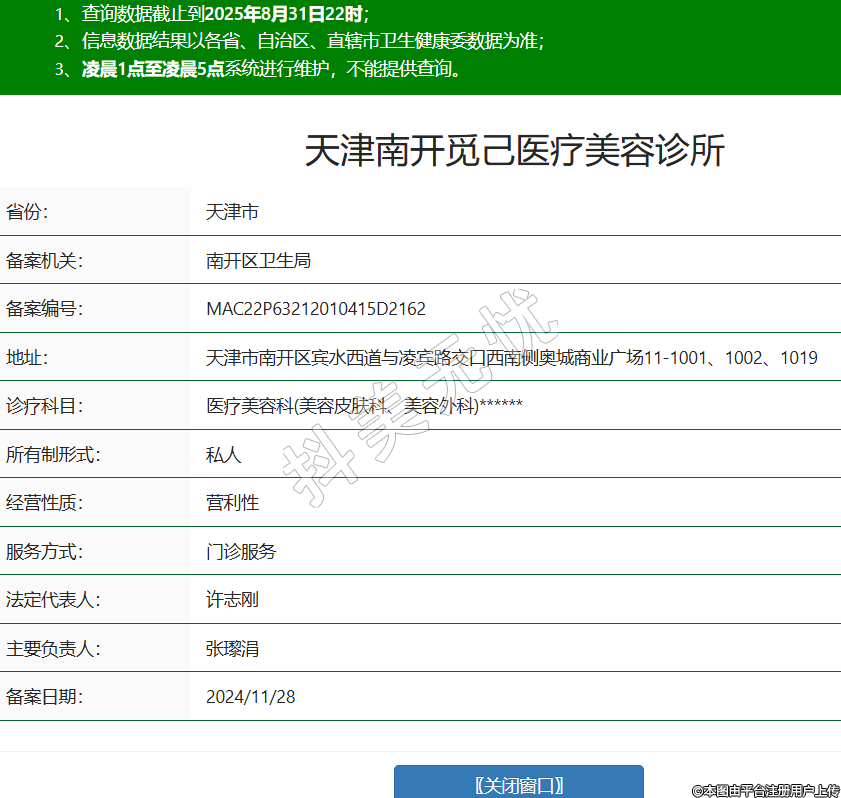 省份:天津市備案機關(guān):南開區(qū)衛(wèi)生局備案編號:MAC22P63212010415D2162地址:天津市南開區(qū)賓水西道與凌賓路交口西南側(cè)奧城商業(yè)廣場11-1001、1002、1019診療科目:醫(yī)療美容科(美容皮膚科、美容外科)******所有制形式:私人經(jīng)營性質(zhì):營利性服務方式:門診服務法定代表人:許志剛主要負責人:張瓈涓備案日期:2024/11/28 -