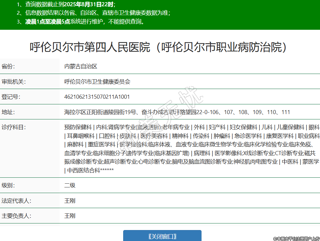 省份:內(nèi)蒙古自治區(qū)審批機(jī)關(guān):呼倫貝爾市衛(wèi)生健康委員會(huì)登記號(hào):46210621315070211A1001地址:海拉爾區(qū)正陽(yáng)街道陵園街19號(hào)、奮斗辦成吉思汗路望園22-0-106、107、108、109、110、111診療科目:預(yù)防保健科 | 內(nèi)科;腎病學(xué)專業(yè)(血液透析);老年病專業(yè) | 外科 | 婦產(chǎn)科 | 婦女保健科 | 兒科 | 兒童保健科 | 眼科 | 耳鼻咽喉科 | 口腔科 | 皮膚科 | 醫(yī)療美容科 | 精神科 | 傳染科 | 腫瘤科 | 急診醫(yī)學(xué)科 | 康復(fù)醫(yī)學(xué)科 | 職業(yè)病科 | 麻醉科 | 重癥醫(yī)學(xué)科 | 醫(yī)學(xué)檢驗(yàn)科;臨床體液、血液專業(yè);臨床微生物學(xué)專業(yè);臨床化學(xué)檢驗(yàn)專業(yè);臨床免疫、血清學(xué)專業(yè);臨床細(xì)胞分子遺傳學(xué)專業(yè)(臨床基因擴(kuò)增) | 病理科 | 醫(yī)學(xué)影像科;X線診斷專業(yè);CT診斷專業(yè);磁共振成像診斷專業(yè);超聲診斷專業(yè);心電診斷專業(yè);腦電及腦血流圖診斷專業(yè);神經(jīng)肌肉電圖專業(yè) | 中醫(yī)科 | 蒙醫(yī)學(xué) | 中西醫(yī)結(jié)合科******級(jí)別:二級(jí)法定代表人:王剛主要負(fù)責(zé)人:王剛執(zhí)業(yè)許可證有效期:2024/02/06 -至- 2039/02/05 -