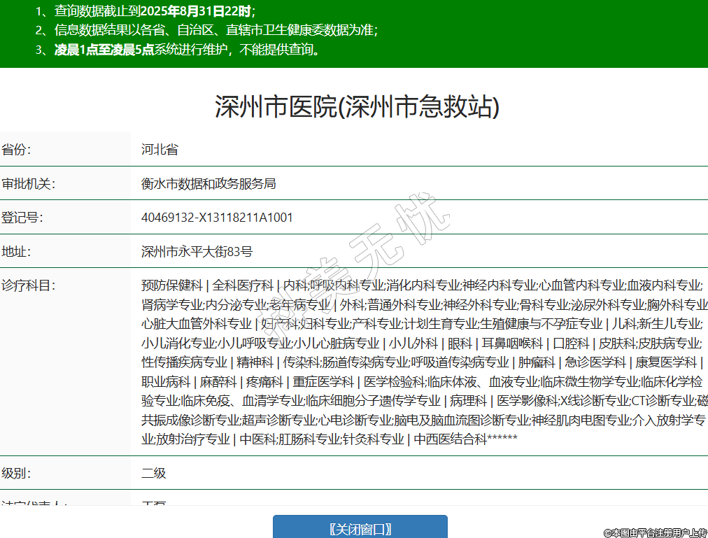 省份:河北省審批機關(guān):衡水市數(shù)據(jù)和政務(wù)服務(wù)局登記號:40469132-X13118211A1001地址:深州市永平大街83號診療科目:預(yù)防保健科 | 全科醫(yī)療科 | 內(nèi)科;呼吸內(nèi)科專業(yè);消化內(nèi)科專業(yè);神經(jīng)內(nèi)科專業(yè);心血管內(nèi)科專業(yè);血液內(nèi)科專業(yè);腎病學(xué)專業(yè);內(nèi)分泌專業(yè);老年病專業(yè) | 外科;普通外科專業(yè);神經(jīng)外科專業(yè);骨科專業(yè);泌尿外科專業(yè);胸外科專業(yè);心臟大血管外科專業(yè) | 婦產(chǎn)科;婦科專業(yè);產(chǎn)科專業(yè);計劃生育專業(yè);生殖健康與不孕癥專業(yè) | 兒科;新生兒專業(yè);小兒消化專業(yè);小兒呼吸專業(yè);小兒心臟病專業(yè) | 小兒外科 | 眼科 | 耳鼻咽喉科 | 口腔科 | 皮膚科;皮膚病專業(yè);性傳播疾病專業(yè) | 精神科 | 傳染科;腸道傳染病專業(yè);呼吸道傳染病專業(yè) | 腫瘤科 | 急診醫(yī)學(xué)科 | 康復(fù)醫(yī)學(xué)科 | 職業(yè)病科 | 麻醉科 | 疼痛科 | 重癥醫(yī)學(xué)科 | 醫(yī)學(xué)檢驗科;臨床體液、血液專業(yè);臨床微生物學(xué)專業(yè);臨床化學(xué)檢驗專業(yè);臨床免疫、血清學(xué)專業(yè);臨床細胞分子遺傳學(xué)專業(yè) | 病理科 | 醫(yī)學(xué)影像科;X線診斷專業(yè);CT診斷專業(yè);磁共振成像診斷專業(yè);超聲診斷專業(yè);心電診斷專業(yè);腦電及腦血流圖診斷專業(yè);神經(jīng)肌肉電圖專業(yè);介入放射學(xué)專業(yè);放射治療專業(yè) | 中醫(yī)科;肛腸科專業(yè);針灸科專業(yè) | 中西醫(yī)結(jié)合科******級別:二級法定代表人:王磊主要負責(zé)人:寇興執(zhí)業(yè)許可證有效期:2017/12/02 -至- 2032/12/01 -