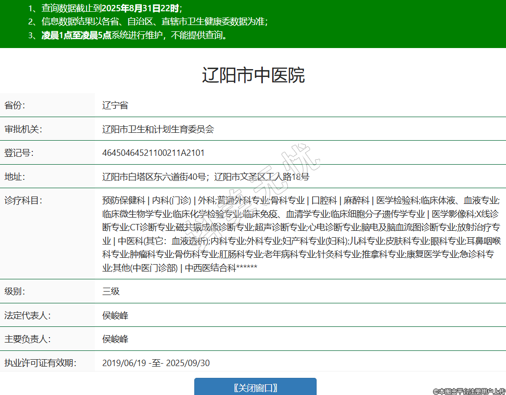 省份:遼寧省審批機關(guān):遼陽市衛(wèi)生和計劃生育委員會登記號:46450464521100211A2101地址:遼陽市白塔區(qū)東六道街40號;遼陽市文圣區(qū)工人路18號診療科目:預(yù)防保健科 | 內(nèi)科(門診) | 外科;普通外科專業(yè);骨科專業(yè) | 口腔科 | 麻醉科 | 醫(yī)學(xué)檢驗科;臨床體液、血液專業(yè);臨床微生物學(xué)專業(yè);臨床化學(xué)檢驗專業(yè);臨床免疫、血清學(xué)專業(yè);臨床細(xì)胞分子遺傳學(xué)專業(yè) | 醫(yī)學(xué)影像科;X線診斷專業(yè);CT診斷專業(yè);磁共振成像診斷專業(yè);超聲診斷專業(yè);心電診斷專業(yè);腦電及腦血流圖診斷專業(yè);放射治療專業(yè) | 中醫(yī)科(其它:血液透析);內(nèi)科專業(yè);外科專業(yè);婦產(chǎn)科專業(yè)(婦科);兒科專業(yè);皮膚科專業(yè);眼科專業(yè);耳鼻咽喉科專業(yè);腫瘤科專業(yè);骨傷科專業(yè);肛腸科專業(yè);老年病科專業(yè);針灸科專業(yè);推拿科專業(yè);康復(fù)醫(yī)學(xué)專業(yè);急診科專業(yè);其他(中醫(yī)門診部) | 中西醫(yī)結(jié)合科******級別:三級法定代表人:侯峻峰主要負(fù)責(zé)人:侯峻峰執(zhí)業(yè)許可證有效期:2019/06/19 -至- 2025/09/30 -