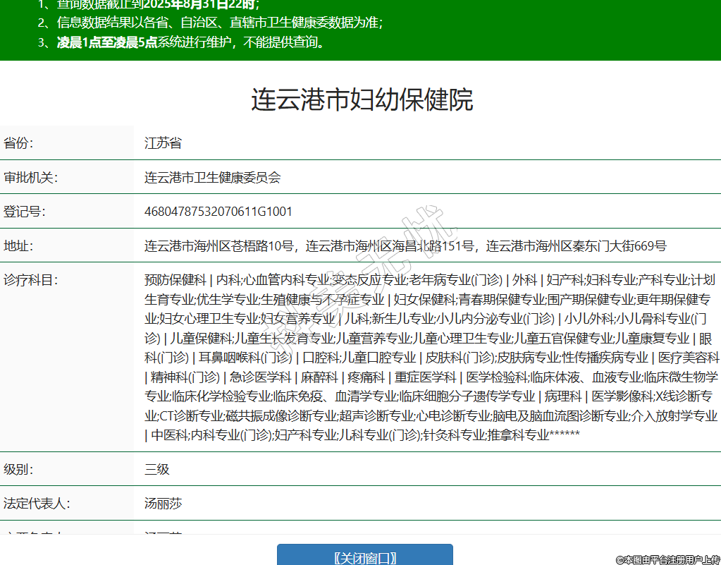 省份:江蘇省審批機(jī)關(guān):連云港市衛(wèi)生健康委員會(huì)登記號(hào):46804787532070611G1001地址:連云港市海州區(qū)蒼梧路10號(hào),連云港市海州區(qū)海昌北路151號(hào),連云港市海州區(qū)秦東門(mén)大街669號(hào)診療科目:預(yù)防保健科 | 內(nèi)科;心血管內(nèi)科專(zhuān)業(yè);變態(tài)反應(yīng)專(zhuān)業(yè);老年病專(zhuān)業(yè)(門(mén)診) | 外科 | 婦產(chǎn)科;婦科專(zhuān)業(yè);產(chǎn)科專(zhuān)業(yè);計(jì)劃生育專(zhuān)業(yè);優(yōu)生學(xué)專(zhuān)業(yè);生殖健康與不孕癥專(zhuān)業(yè) | 婦女保健科;青春期保健專(zhuān)業(yè);圍產(chǎn)期保健專(zhuān)業(yè);更年期保健專(zhuān)業(yè);婦女心理衛(wèi)生專(zhuān)業(yè);婦女營(yíng)養(yǎng)專(zhuān)業(yè) | 兒科;新生兒專(zhuān)業(yè);小兒內(nèi)分泌專(zhuān)業(yè)(門(mén)診) | 小兒外科;小兒骨科專(zhuān)業(yè)(門(mén)診) | 兒童保健科;兒童生長(zhǎng)發(fā)育專(zhuān)業(yè);兒童營(yíng)養(yǎng)專(zhuān)業(yè);兒童心理衛(wèi)生專(zhuān)業(yè);兒童五官保健專(zhuān)業(yè);兒童康復(fù)專(zhuān)業(yè) | 眼科(門(mén)診) | 耳鼻咽喉科(門(mén)診) | 口腔科;兒童口腔專(zhuān)業(yè) | 皮膚科(門(mén)診);皮膚病專(zhuān)業(yè);性傳播疾病專(zhuān)業(yè) | 醫(yī)療美容科 | 精神科(門(mén)診) | 急診醫(yī)學(xué)科 | 麻醉科 | 疼痛科 | 重癥醫(yī)學(xué)科 | 醫(yī)學(xué)檢驗(yàn)科;臨床體液、血液專(zhuān)業(yè);臨床微生物學(xué)專(zhuān)業(yè);臨床化學(xué)檢驗(yàn)專(zhuān)業(yè);臨床免疫、血清學(xué)專(zhuān)業(yè);臨床細(xì)胞分子遺傳學(xué)專(zhuān)業(yè) | 病理科 | 醫(yī)學(xué)影像科;X線診斷專(zhuān)業(yè);CT診斷專(zhuān)業(yè);磁共振成像診斷專(zhuān)業(yè);超聲診斷專(zhuān)業(yè);心電診斷專(zhuān)業(yè);腦電及腦血流圖診斷專(zhuān)業(yè);介入放射學(xué)專(zhuān)業(yè) | 中醫(yī)科;內(nèi)科專(zhuān)業(yè)(門(mén)診);婦產(chǎn)科專(zhuān)業(yè);兒科專(zhuān)業(yè)(門(mén)診);針灸科專(zhuān)業(yè);推拿科專(zhuān)業(yè)******級(jí)別:三級(jí)法定代表人:湯麗莎主要負(fù)責(zé)人:湯麗莎執(zhí)業(yè)許可證有效期:2021/12/30 -至- 2036/12/30 -