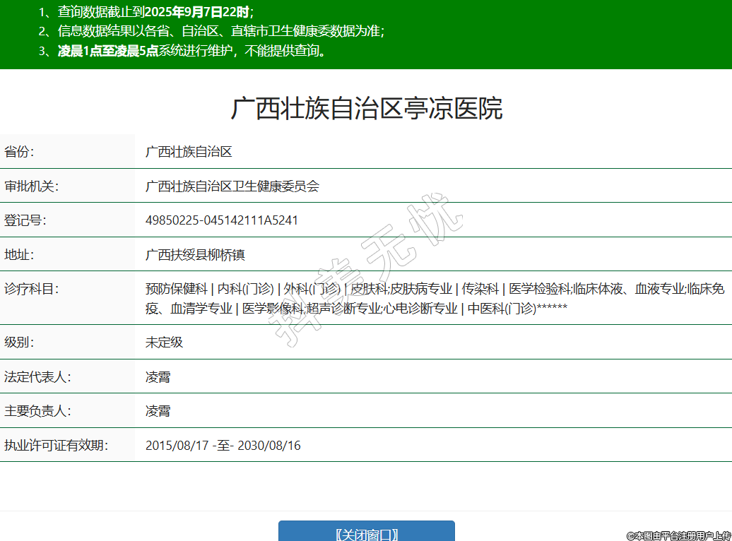 省份:廣西壯族自治區(qū)審批機(jī)關(guān):廣西壯族自治區(qū)衛(wèi)生健康委員會登記號:49850225-045142111A5241地址:廣西扶綏縣柳橋鎮(zhèn)診療科目:預(yù)防保健科 | 內(nèi)科(門診) | 外科(門診) | 皮膚科;皮膚病專業(yè) | 傳染科 | 醫(yī)學(xué)檢驗(yàn)科;臨床體液、血液專業(yè);臨床免疫、血清學(xué)專業(yè) | 醫(yī)學(xué)影像科;超聲診斷專業(yè);心電診斷專業(yè) | 中醫(yī)科(門診)******級別:未定級法定代表人:凌霄主要負(fù)責(zé)人:凌霄執(zhí)業(yè)許可證有效期:2015/08/17 -至- 2030/08/16 -