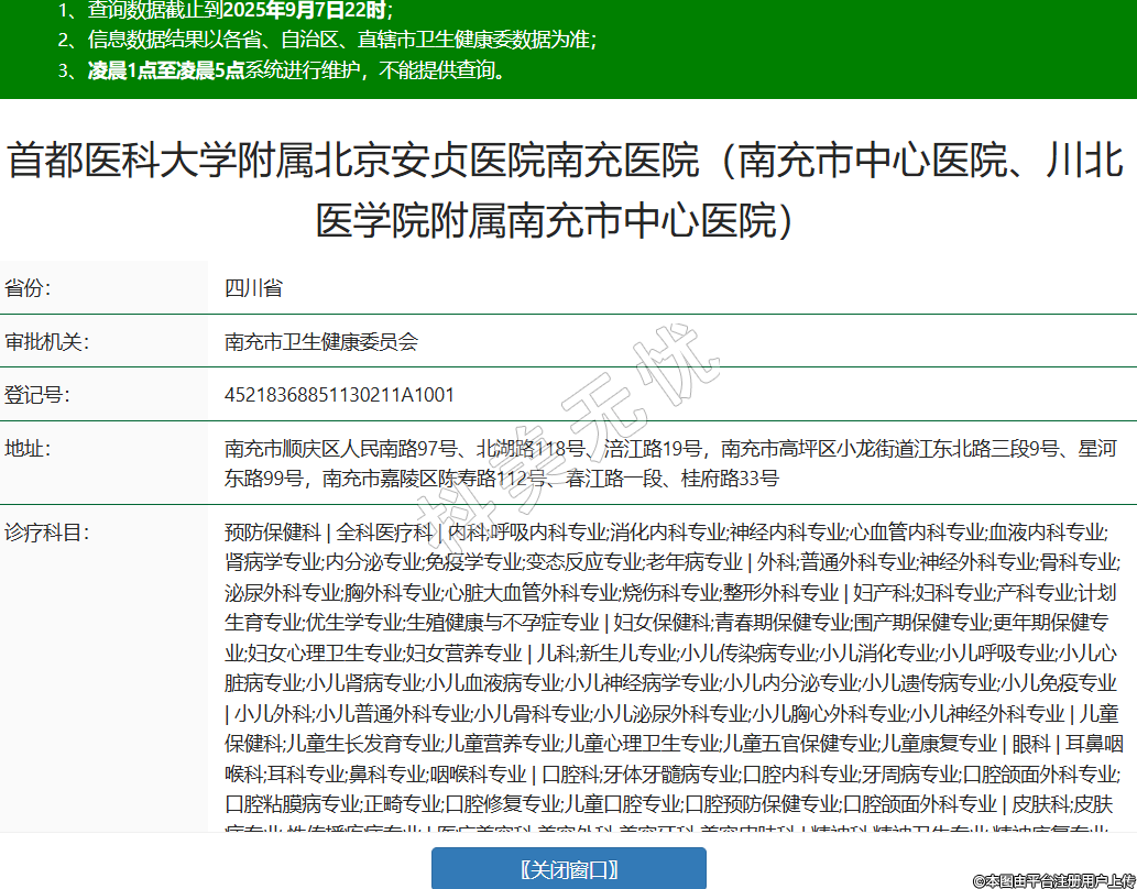 省份:四川省審批機(jī)關(guān):南充市衛(wèi)生健康委員會登記號:45218368851130211A1001地址:南充市順慶區(qū)人民南路97號、北湖路118號、涪江路19號,南充市高坪區(qū)小龍街道江東北路三段9號、星河?xùn)|路99號,南充市嘉陵區(qū)陳壽路112號、春江路一段、桂府路33號診療科目:預(yù)防保健科 | 全科醫(yī)療科 | 內(nèi)科;呼吸內(nèi)科專業(yè);消化內(nèi)科專業(yè);神經(jīng)內(nèi)科專業(yè);心血管內(nèi)科專業(yè);血液內(nèi)科專業(yè);腎病學(xué)專業(yè);內(nèi)分泌專業(yè);免疫學(xué)專業(yè);變態(tài)反應(yīng)專業(yè);老年病專業(yè) | 外科;普通外科專業(yè);神經(jīng)外科專業(yè);骨科專業(yè);泌尿外科專業(yè);胸外科專業(yè);心臟大血管外科專業(yè);燒傷科專業(yè);整形外科專業(yè) | 婦產(chǎn)科;婦科專業(yè);產(chǎn)科專業(yè);計劃生育專業(yè);優(yōu)生學(xué)專業(yè);生殖健康與不孕癥專業(yè) | 婦女保健科;青春期保健專業(yè);圍產(chǎn)期保健專業(yè);更年期保健專業(yè);婦女心理衛(wèi)生專業(yè);婦女營養(yǎng)專業(yè) | 兒科;新生兒專業(yè);小兒傳染病專業(yè);小兒消化專業(yè);小兒呼吸專業(yè);小兒心臟病專業(yè);小兒腎病專業(yè);小兒血液病專業(yè);小兒神經(jīng)病學(xué)專業(yè);小兒內(nèi)分泌專業(yè);小兒遺傳病專業(yè);小兒免疫專業(yè) | 小兒外科;小兒普通外科專業(yè);小兒骨科專業(yè);小兒泌尿外科專業(yè);小兒胸心外科專業(yè);小兒神經(jīng)外科專業(yè) | 兒童保健科;兒童生長發(fā)育專業(yè);兒童營養(yǎng)專業(yè);兒童心理衛(wèi)生專業(yè);兒童五官保健專業(yè);兒童康復(fù)專業(yè) | 眼科 | 耳鼻咽喉科;耳科專業(yè);鼻科專業(yè);咽喉科專業(yè) | 口腔科;牙體牙髓病專業(yè);口腔內(nèi)科專業(yè);牙周病專業(yè);口腔頜面外科專業(yè);口腔粘膜病專業(yè);正畸專業(yè);口腔修復(fù)專業(yè);兒童口腔專業(yè);口腔預(yù)防保健專業(yè);口腔頜面外科專業(yè) | 皮膚科;皮膚病專業(yè);性傳播疾病專業(yè) | 醫(yī)療美容科;美容外科;美容牙科;美容皮膚科 | 精神科;精神衛(wèi)生專業(yè);精神康復(fù)專業(yè);臨床心理專業(yè) | 傳染科;腸道傳染病專業(yè);呼吸道傳染病專業(yè);肝炎專業(yè);蟲媒傳染病專業(yè);動物源性傳染病專業(yè);蠕蟲病專業(yè) | 結(jié)核病科 | 腫瘤科 | 急診醫(yī)學(xué)科 | 康復(fù)醫(yī)學(xué)科 | 職業(yè)病科(門診);職業(yè)中毒專業(yè)(門診);塵肺專業(yè)(門診);放射病專業(yè)(門診);物理因素?fù)p傷專業(yè)(門診);職業(yè)健康監(jiān)護(hù)專業(yè)(門診) | 麻醉科 | 疼痛科 | 重癥醫(yī)學(xué)科 | 醫(yī)學(xué)檢驗科;臨床體液、血液專業(yè);臨床微生物學(xué)專業(yè);臨床化學(xué)檢驗專業(yè);臨床免疫、血清學(xué)專業(yè);臨床細(xì)胞分子遺傳學(xué)專業(yè) | 病理科 | 醫(yī)學(xué)影像科;X線診斷專業(yè);CT診斷專業(yè);磁共振成像診斷專業(yè);核醫(yī)學(xué)專業(yè);超聲診斷專業(yè);心電診斷專業(yè);腦電及腦血流圖診斷專業(yè);神經(jīng)肌肉電圖專業(yè);介入放射學(xué)專業(yè);放射治療專業(yè) | 中醫(yī)科;內(nèi)科專業(yè);外科專業(yè);婦產(chǎn)科專業(yè);兒科專業(yè);眼科專業(yè);耳鼻咽喉科專業(yè);腫瘤科專業(yè);骨傷科專業(yè);肛腸科專業(yè);老年病科專業(yè);針灸科專業(yè);推拿科專業(yè);康復(fù)醫(yī)學(xué)專業(yè);急診科專業(yè) | 中西醫(yī)結(jié)合科******級別:三級法定代表人:劉楊主要負(fù)責(zé)人:劉楊執(zhí)業(yè)許可證有效期:2025/07/03 -至- 2036/09/14 -