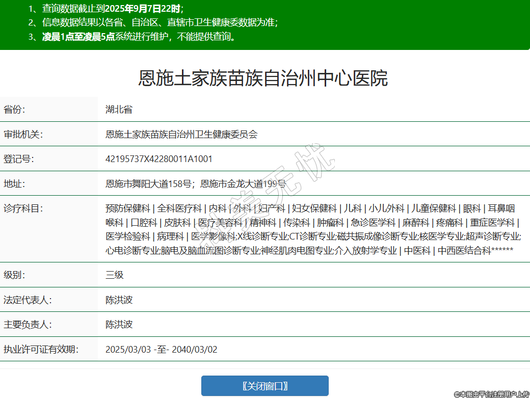 省份:湖北省審批機(jī)關(guān):恩施土家族苗族自治州衛(wèi)生健康委員會(huì)登記號(hào):42195737X42280011A1001地址:恩施市舞陽(yáng)大道158號(hào);恩施市金龍大道199號(hào)診療科目:預(yù)防保健科 | 全科醫(yī)療科 | 內(nèi)科 | 外科 | 婦產(chǎn)科 | 婦女保健科 | 兒科 | 小兒外科 | 兒童保健科 | 眼科 | 耳鼻咽喉科 | 口腔科 | 皮膚科 | 醫(yī)療美容科 | 精神科 | 傳染科 | 腫瘤科 | 急診醫(yī)學(xué)科 | 麻醉科 | 疼痛科 | 重癥醫(yī)學(xué)科 | 醫(yī)學(xué)檢驗(yàn)科 | 病理科 | 醫(yī)學(xué)影像科;X線診斷專(zhuān)業(yè);CT診斷專(zhuān)業(yè);磁共振成像診斷專(zhuān)業(yè);核醫(yī)學(xué)專(zhuān)業(yè);超聲診斷專(zhuān)業(yè);心電診斷專(zhuān)業(yè);腦電及腦血流圖診斷專(zhuān)業(yè);神經(jīng)肌肉電圖專(zhuān)業(yè);介入放射學(xué)專(zhuān)業(yè) | 中醫(yī)科 | 中西醫(yī)結(jié)合科******級(jí)別:三級(jí)法定代表人:陳洪波主要負(fù)責(zé)人:陳洪波執(zhí)業(yè)許可證有效期:2025/03/03 -至- 2040/03/02 -