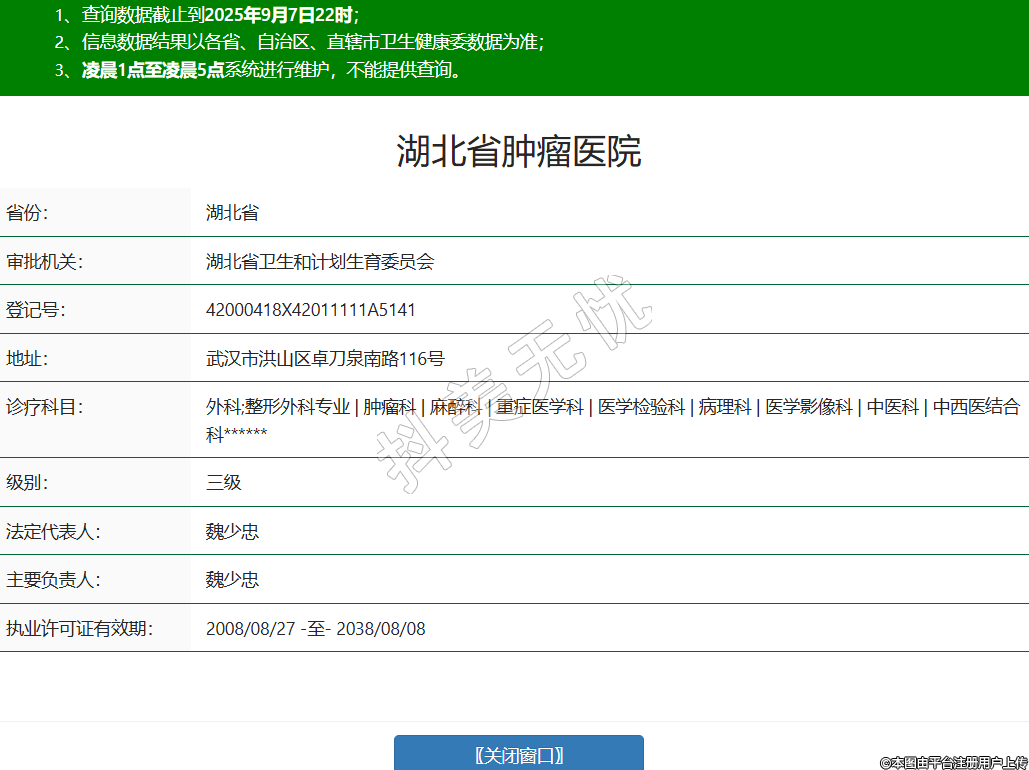 省份:湖北省審批機關:湖北省衛(wèi)生和計劃生育委員會登記號:42000418X42011111A5141地址:武漢市洪山區(qū)卓刀泉南路116號診療科目:外科;整形外科專業(yè) | 腫瘤科 | 麻醉科 | 重癥醫(yī)學科 | 醫(yī)學檢驗科 | 病理科 | 醫(yī)學影像科 | 中醫(yī)科 | 中西醫(yī)結合科******級別:三級法定代表人:魏少忠主要負責人:魏少忠執(zhí)業(yè)許可證有效期:2008/08/27 -至- 2038/08/08 -