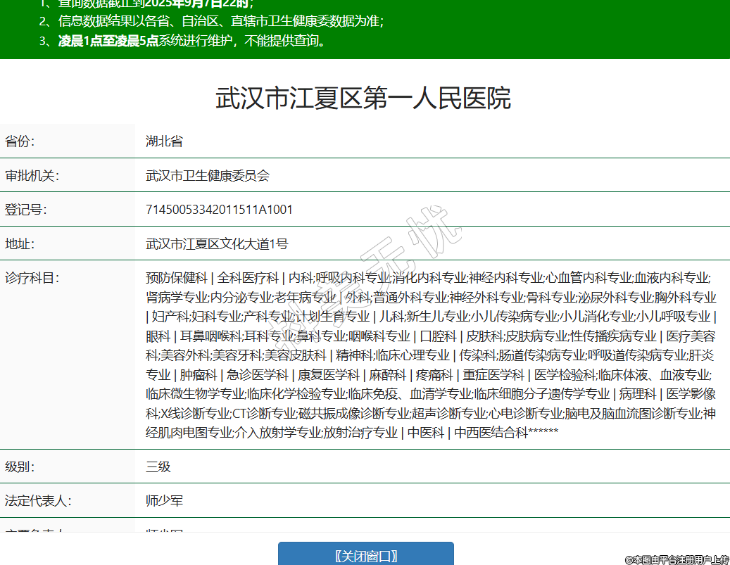 省份:湖北省審批機關:武漢市衛(wèi)生健康委員會登記號:71450053342011511A1001地址:武漢市江夏區(qū)文化大道1號診療科目:預防保健科 | 全科醫(yī)療科 | 內(nèi)科;呼吸內(nèi)科專業(yè);消化內(nèi)科專業(yè);神經(jīng)內(nèi)科專業(yè);心血管內(nèi)科專業(yè);血液內(nèi)科專業(yè);腎病學專業(yè);內(nèi)分泌專業(yè);老年病專業(yè) | 外科;普通外科專業(yè);神經(jīng)外科專業(yè);骨科專業(yè);泌尿外科專業(yè);胸外科專業(yè) | 婦產(chǎn)科;婦科專業(yè);產(chǎn)科專業(yè);計劃生育專業(yè) | 兒科;新生兒專業(yè);小兒傳染病專業(yè);小兒消化專業(yè);小兒呼吸專業(yè) | 眼科 | 耳鼻咽喉科;耳科專業(yè);鼻科專業(yè);咽喉科專業(yè) | 口腔科 | 皮膚科;皮膚病專業(yè);性傳播疾病專業(yè) | 醫(yī)療美容科;美容外科;美容牙科;美容皮膚科 | 精神科;臨床心理專業(yè) | 傳染科;腸道傳染病專業(yè);呼吸道傳染病專業(yè);肝炎專業(yè) | 腫瘤科 | 急診醫(yī)學科 | 康復醫(yī)學科 | 麻醉科 | 疼痛科 | 重癥醫(yī)學科 | 醫(yī)學檢驗科;臨床體液、血液專業(yè);臨床微生物學專業(yè);臨床化學檢驗專業(yè);臨床免疫、血清學專業(yè);臨床細胞分子遺傳學專業(yè) | 病理科 | 醫(yī)學影像科;X線診斷專業(yè);CT診斷專業(yè);磁共振成像診斷專業(yè);超聲診斷專業(yè);心電診斷專業(yè);腦電及腦血流圖診斷專業(yè);神經(jīng)肌肉電圖專業(yè);介入放射學專業(yè);放射治療專業(yè) | 中醫(yī)科 | 中西醫(yī)結合科******級別:三級法定代表人:師少軍主要負責人:師少軍執(zhí)業(yè)許可證有效期:2018/11/08 -至- 2033/11/07 -