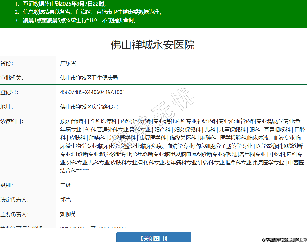 省份:廣東省審批機(jī)關(guān):佛山市禪城區(qū)衛(wèi)生健康局登記號(hào):45607485-X44060419A1001地址:佛山市禪城區(qū)慶寧路43號(hào)診療科目:預(yù)防保健科 | 全科醫(yī)療科 | 內(nèi)科;呼吸內(nèi)科專業(yè);消化內(nèi)科專業(yè);神經(jīng)內(nèi)科專業(yè);心血管內(nèi)科專業(yè);腎病學(xué)專業(yè);老年病專業(yè) | 外科;普通外科專業(yè);骨科專業(yè) | 婦產(chǎn)科 | 婦女保健科 | 兒科 | 兒童保健科 | 眼科 | 耳鼻咽喉科 | 口腔科 | 皮膚科 | 腫瘤科 | 急診醫(yī)學(xué)科 | 康復(fù)醫(yī)學(xué)科 | 臨終關(guān)懷科 | 麻醉科 | 醫(yī)學(xué)檢驗(yàn)科;臨床體液、血液專業(yè);臨床微生物學(xué)專業(yè);臨床化學(xué)檢驗(yàn)專業(yè);臨床免疫、血清學(xué)專業(yè);臨床細(xì)胞分子遺傳學(xué)專業(yè) | 醫(yī)學(xué)影像科;X線診斷專業(yè);CT診斷專業(yè);超聲診斷專業(yè);心電診斷專業(yè);腦電及腦血流圖診斷專業(yè);神經(jīng)肌肉電圖專業(yè) | 中醫(yī)科;內(nèi)科專業(yè);外科專業(yè);兒科專業(yè);皮膚科專業(yè);骨傷科專業(yè);老年病科專業(yè);針灸科專業(yè);推拿科專業(yè);康復(fù)醫(yī)學(xué)專業(yè) | 中西醫(yī)結(jié)合科******級(jí)別:二級(jí)法定代表人:郭亮主要負(fù)責(zé)人:劉柳英執(zhí)業(yè)許可證有效期:2013/08/23 -至- 2028/08/23 -