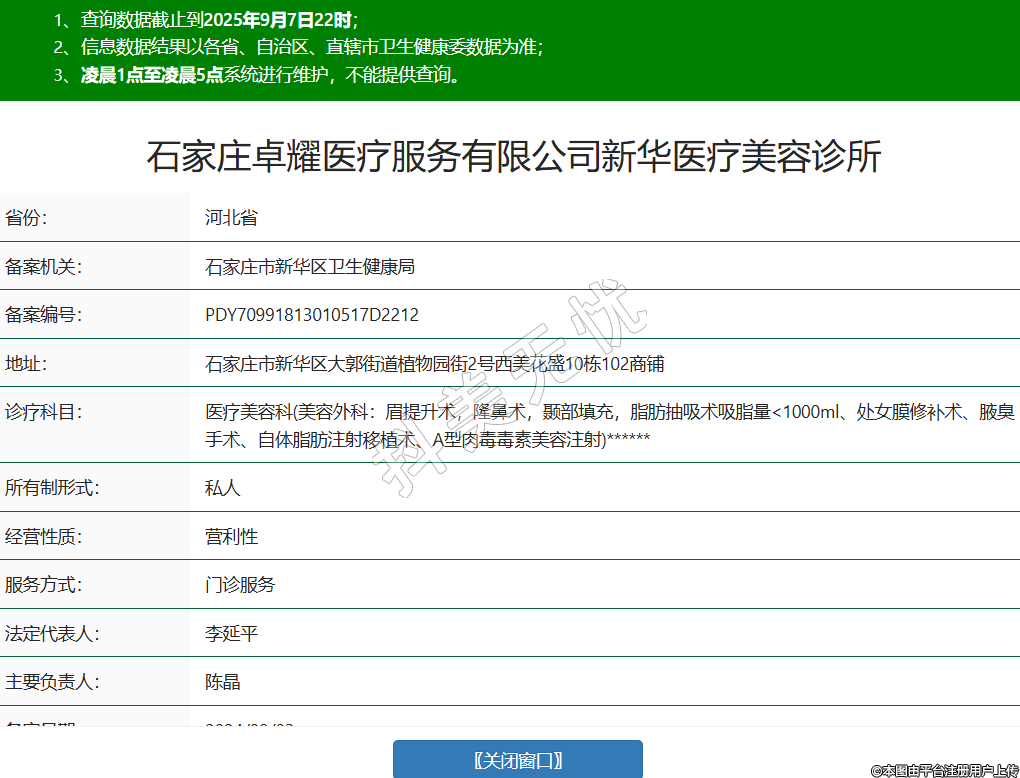 省份:河北省備案機(jī)關(guān):石家莊市新華區(qū)衛(wèi)生健康局備案編號(hào):PDY70991813010517D2212地址:石家莊市新華區(qū)大郭街道植物園街2號(hào)西美花盛10棟102商鋪診療科目:醫(yī)療美容科(美容外科:眉提升術(shù),隆鼻術(shù),顳部填充,脂肪抽吸術(shù)吸脂量<1000ml、處女膜修補(bǔ)術(shù)、腋臭手術(shù)、自體脂肪注射移植術(shù)、A型肉毒毒素美容注射)******所有制形式:私人經(jīng)營(yíng)性質(zhì):營(yíng)利性服務(wù)方式:門(mén)診服務(wù)法定代表人:李延平主要負(fù)責(zé)人:陳晶備案日期:2024/09/03 -