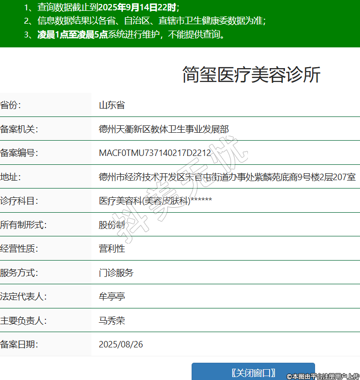 省份:山東省備案機關(guān):德州天衢新區(qū)教體衛(wèi)生事業(yè)發(fā)展部備案編號:MACF0TMU737140217D2212地址:德州市經(jīng)濟技術(shù)開發(fā)區(qū)宋官屯街道辦事處紫麟苑底商9號樓2層207室診療科目:醫(yī)療美容科(美容皮膚科)******所有制形式:股份制經(jīng)營性質(zhì):營利性服務方式:門診服務法定代表人:牟亭亭主要負責人:馬秀榮備案日期:2025/08/26 -