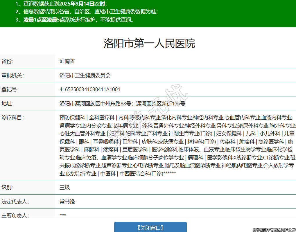 省份:河南省審批機(jī)關(guān):洛陽市衛(wèi)生健康委員會(huì)登記號(hào):41652500341030411A1001地址:洛陽市瀍河回族區(qū)中州東路88號(hào);瀍河回族區(qū)新街156號(hào)診療科目:預(yù)防保健科 | 全科醫(yī)療科 | 內(nèi)科;呼吸內(nèi)科專業(yè);消化內(nèi)科專業(yè);神經(jīng)內(nèi)科專業(yè);心血管內(nèi)科專業(yè);血液內(nèi)科專業(yè);腎病學(xué)專業(yè);內(nèi)分泌專業(yè);老年病專業(yè) | 外科;普通外科專業(yè);神經(jīng)外科專業(yè);骨科專業(yè);泌尿外科專業(yè);胸外科專業(yè);心臟大血管外科專業(yè) | 婦產(chǎn)科;婦科專業(yè);產(chǎn)科專業(yè);計(jì)劃生育專業(yè)(門診) | 婦女保健科 | 兒科 | 小兒外科 | 兒童保健科 | 眼科 | 耳鼻咽喉科 | 口腔科 | 皮膚科;皮膚病專業(yè) | 精神科(門診) | 傳染科 | 腫瘤科 | 急診醫(yī)學(xué)科 | 康復(fù)醫(yī)學(xué)科 | 麻醉科 | 疼痛科 | 重癥醫(yī)學(xué)科 | 醫(yī)學(xué)檢驗(yàn)科;臨床體液、血液專業(yè);臨床微生物學(xué)專業(yè);臨床化學(xué)檢驗(yàn)專業(yè);臨床免疫、血清學(xué)專業(yè);臨床細(xì)胞分子遺傳學(xué)專業(yè) | 病理科 | 醫(yī)學(xué)影像科;X線診斷專業(yè);CT診斷專業(yè);磁共振成像診斷專業(yè);超聲診斷專業(yè);心電診斷專業(yè);腦電及腦血流圖診斷專業(yè);神經(jīng)肌肉電圖專業(yè);介入放射學(xué)專業(yè);放射治療專業(yè) | 中醫(yī)科 | 中西醫(yī)結(jié)合科(門診)******級(jí)別:三級(jí)法定代表人:常書鋒主要負(fù)責(zé)人:***執(zhí)業(yè)許可證有效期:2025/08/11 -至- 2033/04/07 -