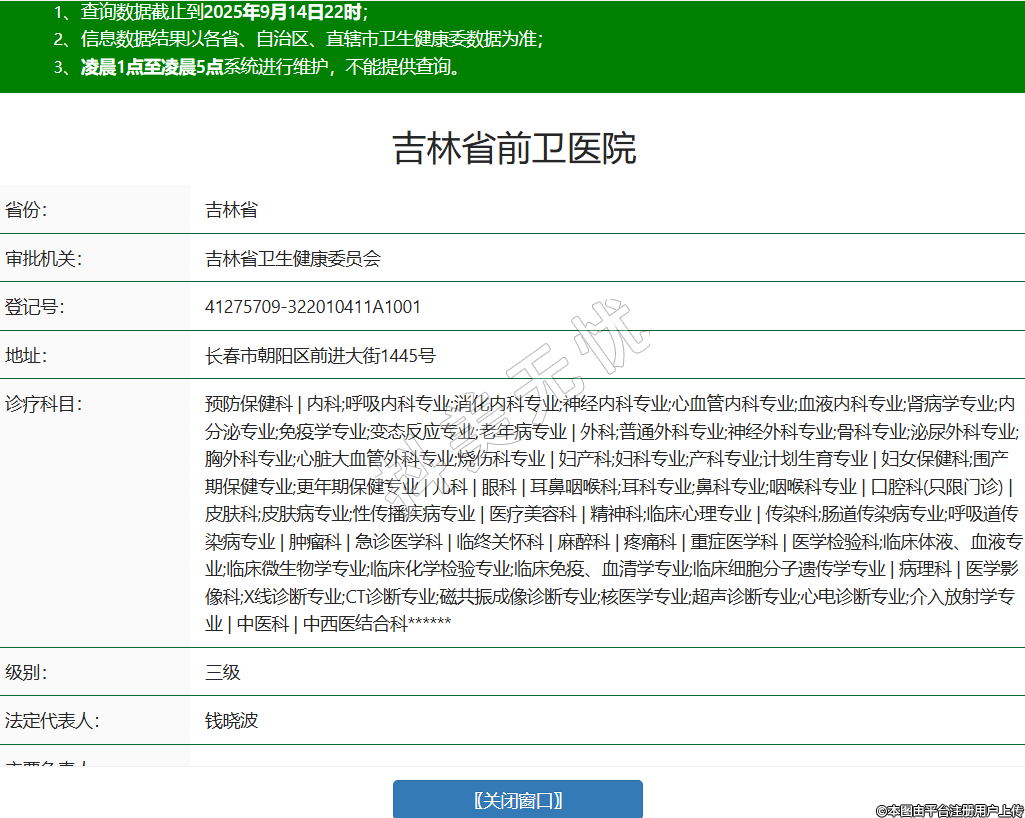 省份:吉林省審批機(jī)關(guān):吉林省衛(wèi)生健康委員會(huì)登記號(hào):41275709-322010411A1001地址:長(zhǎng)春市朝陽(yáng)區(qū)前進(jìn)大街1445號(hào)診療科目:預(yù)防保健科 | 內(nèi)科;呼吸內(nèi)科專業(yè);消化內(nèi)科專業(yè);神經(jīng)內(nèi)科專業(yè);心血管內(nèi)科專業(yè);血液內(nèi)科專業(yè);腎病學(xué)專業(yè);內(nèi)分泌專業(yè);免疫學(xué)專業(yè);變態(tài)反應(yīng)專業(yè);老年病專業(yè) | 外科;普通外科專業(yè);神經(jīng)外科專業(yè);骨科專業(yè);泌尿外科專業(yè);胸外科專業(yè);心臟大血管外科專業(yè);燒傷科專業(yè) | 婦產(chǎn)科;婦科專業(yè);產(chǎn)科專業(yè);計(jì)劃生育專業(yè) | 婦女保健科;圍產(chǎn)期保健專業(yè);更年期保健專業(yè) | 兒科 | 眼科 | 耳鼻咽喉科;耳科專業(yè);鼻科專業(yè);咽喉科專業(yè) | 口腔科(只限門診) | 皮膚科;皮膚病專業(yè);性傳播疾病專業(yè) | 醫(yī)療美容科 | 精神科;臨床心理專業(yè) | 傳染科;腸道傳染病專業(yè);呼吸道傳染病專業(yè) | 腫瘤科 | 急診醫(yī)學(xué)科 | 臨終關(guān)懷科 | 麻醉科 | 疼痛科 | 重癥醫(yī)學(xué)科 | 醫(yī)學(xué)檢驗(yàn)科;臨床體液、血液專業(yè);臨床微生物學(xué)專業(yè);臨床化學(xué)檢驗(yàn)專業(yè);臨床免疫、血清學(xué)專業(yè);臨床細(xì)胞分子遺傳學(xué)專業(yè) | 病理科 | 醫(yī)學(xué)影像科;X線診斷專業(yè);CT診斷專業(yè);磁共振成像診斷專業(yè);核醫(yī)學(xué)專業(yè);超聲診斷專業(yè);心電診斷專業(yè);介入放射學(xué)專業(yè) | 中醫(yī)科 | 中西醫(yī)結(jié)合科******級(jí)別:三級(jí)法定代表人:錢曉波主要負(fù)責(zé)人:執(zhí)業(yè)許可證有效期:2025/06/09 -至- 2040/06/08 -
