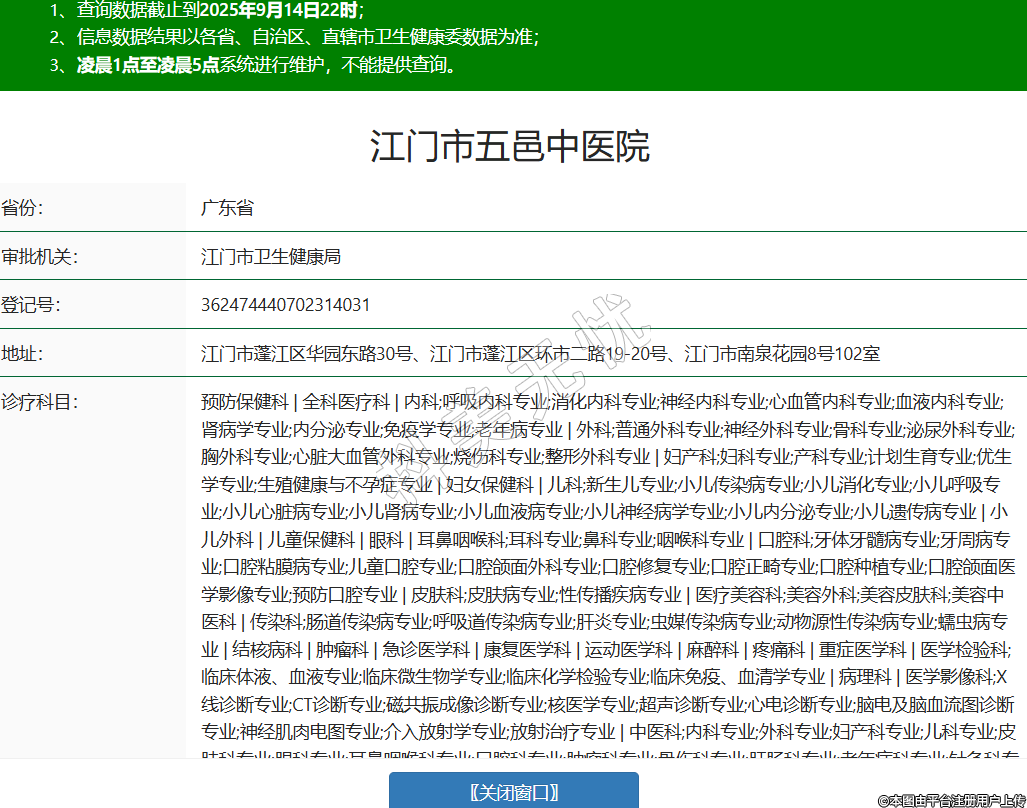 省份:廣東省審批機(jī)關(guān):江門市衛(wèi)生健康局登記號(hào):362474440702314031地址:江門市蓬江區(qū)華園東路30號(hào)、江門市蓬江區(qū)環(huán)市二路19-20號(hào)、江門市南泉花園8號(hào)102室診療科目:預(yù)防保健科 | 全科醫(yī)療科 | 內(nèi)科;呼吸內(nèi)科專業(yè);消化內(nèi)科專業(yè);神經(jīng)內(nèi)科專業(yè);心血管內(nèi)科專業(yè);血液內(nèi)科專業(yè);腎病學(xué)專業(yè);內(nèi)分泌專業(yè);免疫學(xué)專業(yè);老年病專業(yè) | 外科;普通外科專業(yè);神經(jīng)外科專業(yè);骨科專業(yè);泌尿外科專業(yè);胸外科專業(yè);心臟大血管外科專業(yè);燒傷科專業(yè);整形外科專業(yè) | 婦產(chǎn)科;婦科專業(yè);產(chǎn)科專業(yè);計(jì)劃生育專業(yè);優(yōu)生學(xué)專業(yè);生殖健康與不孕癥專業(yè) | 婦女保健科 | 兒科;新生兒專業(yè);小兒傳染病專業(yè);小兒消化專業(yè);小兒呼吸專業(yè);小兒心臟病專業(yè);小兒腎病專業(yè);小兒血液病專業(yè);小兒神經(jīng)病學(xué)專業(yè);小兒內(nèi)分泌專業(yè);小兒遺傳病專業(yè) | 小兒外科 | 兒童保健科 | 眼科 | 耳鼻咽喉科;耳科專業(yè);鼻科專業(yè);咽喉科專業(yè) | 口腔科;牙體牙髓病專業(yè);牙周病專業(yè);口腔粘膜病專業(yè);兒童口腔專業(yè);口腔頜面外科專業(yè);口腔修復(fù)專業(yè);口腔正畸專業(yè);口腔種植專業(yè);口腔頜面醫(yī)學(xué)影像專業(yè);預(yù)防口腔專業(yè) | 皮膚科;皮膚病專業(yè);性傳播疾病專業(yè) | 醫(yī)療美容科;美容外科;美容皮膚科;美容中醫(yī)科 | 傳染科;腸道傳染病專業(yè);呼吸道傳染病專業(yè);肝炎專業(yè);蟲媒傳染病專業(yè);動(dòng)物源性傳染病專業(yè);蠕蟲病專業(yè) | 結(jié)核病科 | 腫瘤科 | 急診醫(yī)學(xué)科 | 康復(fù)醫(yī)學(xué)科 | 運(yùn)動(dòng)醫(yī)學(xué)科 | 麻醉科 | 疼痛科 | 重癥醫(yī)學(xué)科 | 醫(yī)學(xué)檢驗(yàn)科;臨床體液、血液專業(yè);臨床微生物學(xué)專業(yè);臨床化學(xué)檢驗(yàn)專業(yè);臨床免疫、血清學(xué)專業(yè) | 病理科 | 醫(yī)學(xué)影像科;X線診斷專業(yè);CT診斷專業(yè);磁共振成像診斷專業(yè);核醫(yī)學(xué)專業(yè);超聲診斷專業(yè);心電診斷專業(yè);腦電及腦血流圖診斷專業(yè);神經(jīng)肌肉電圖專業(yè);介入放射學(xué)專業(yè);放射治療專業(yè) | 中醫(yī)科;內(nèi)科專業(yè);外科專業(yè);婦產(chǎn)科專業(yè);兒科專業(yè);皮膚科專業(yè);眼科專業(yè);耳鼻咽喉科專業(yè);口腔科專業(yè);腫瘤科專業(yè);骨傷科專業(yè);肛腸科專業(yè);老年病科專業(yè);針灸科專業(yè);推拿科專業(yè);康復(fù)醫(yī)學(xué)專業(yè);急診科專業(yè);預(yù)防保健科專業(yè) | 中西醫(yī)結(jié)合科******級(jí)別:三級(jí)法定代表人:章光華主要負(fù)責(zé)人:執(zhí)業(yè)許可證有效期:2025/08/05 -至- 2040/08/04 -
