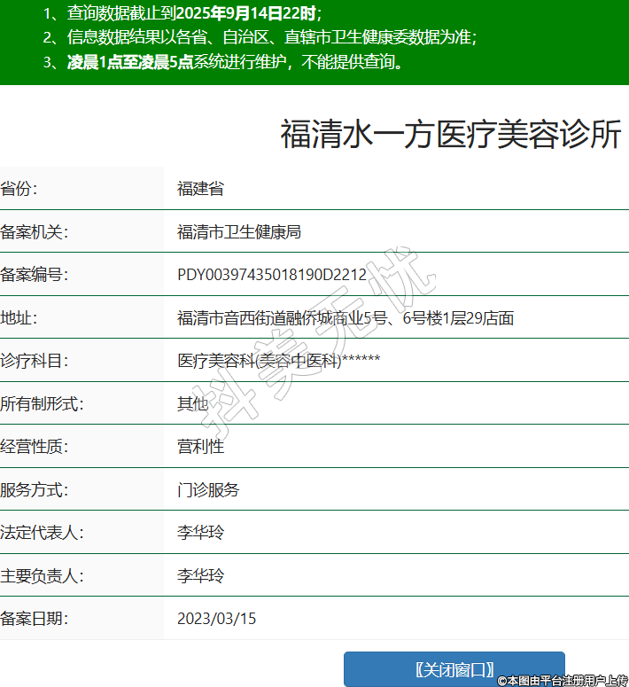 省份:福建省備案機(jī)關(guān):福清市衛(wèi)生健康局備案編號(hào):PDY00397435018190D2212地址:福清市音西街道融僑城商業(yè)5號(hào)、6號(hào)樓1層29店面診療科目:醫(yī)療美容科(美容中醫(yī)科)******所有制形式:其他經(jīng)營(yíng)性質(zhì):營(yíng)利性服務(wù)方式:門(mén)診服務(wù)法定代表人:李華玲主要負(fù)責(zé)人:李華玲備案日期:2023/03/15 -