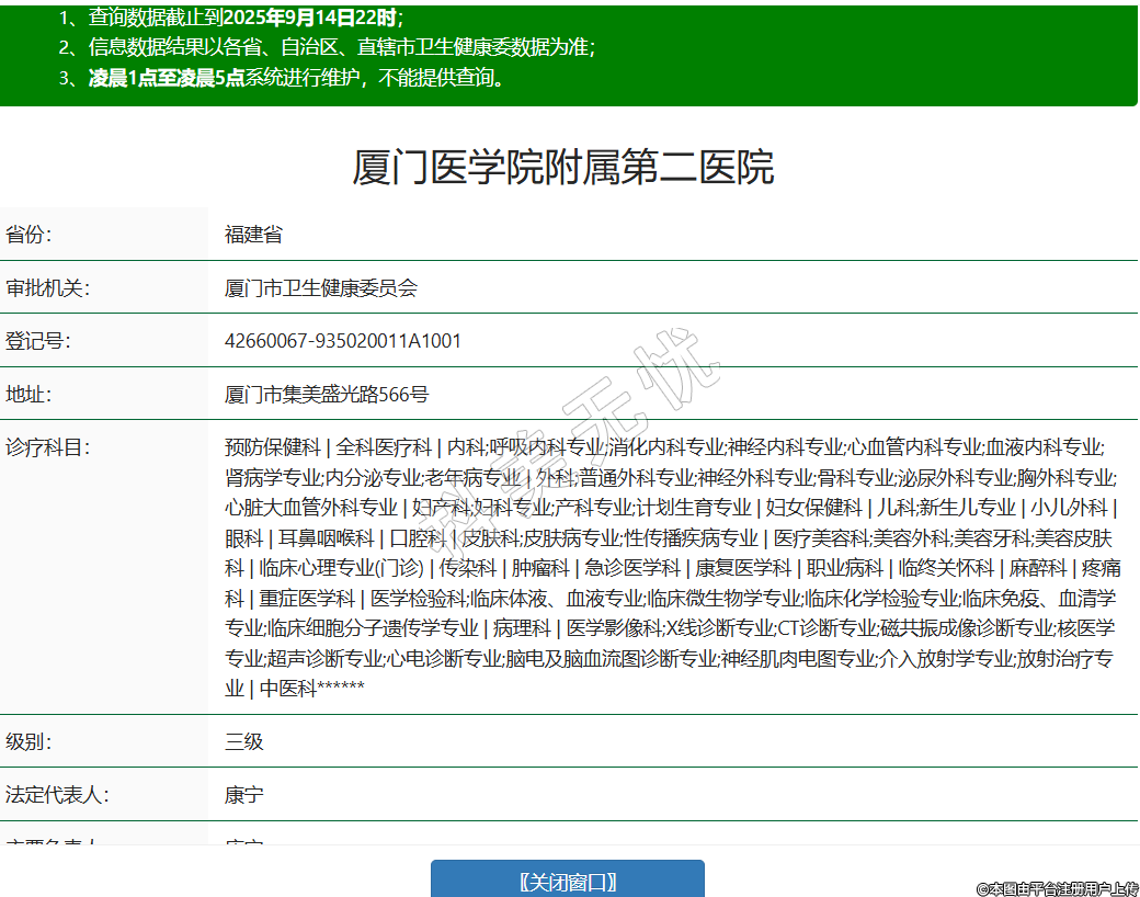 省份:福建省審批機關(guān):廈門市衛(wèi)生健康委員會登記號:42660067-935020011A1001地址:廈門市集美盛光路566號診療科目:預防保健科 | 全科醫(yī)療科 | 內(nèi)科;呼吸內(nèi)科專業(yè);消化內(nèi)科專業(yè);神經(jīng)內(nèi)科專業(yè);心血管內(nèi)科專業(yè);血液內(nèi)科專業(yè);腎病學專業(yè);內(nèi)分泌專業(yè);老年病專業(yè) | 外科;普通外科專業(yè);神經(jīng)外科專業(yè);骨科專業(yè);泌尿外科專業(yè);胸外科專業(yè);心臟大血管外科專業(yè) | 婦產(chǎn)科;婦科專業(yè);產(chǎn)科專業(yè);計劃生育專業(yè) | 婦女保健科 | 兒科;新生兒專業(yè) | 小兒外科 | 眼科 | 耳鼻咽喉科 | 口腔科 | 皮膚科;皮膚病專業(yè);性傳播疾病專業(yè) | 醫(yī)療美容科;美容外科;美容牙科;美容皮膚科 | 臨床心理專業(yè)(門診) | 傳染科 | 腫瘤科 | 急診醫(yī)學科 | 康復醫(yī)學科 | 職業(yè)病科 | 臨終關(guān)懷科 | 麻醉科 | 疼痛科 | 重癥醫(yī)學科 | 醫(yī)學檢驗科;臨床體液、血液專業(yè);臨床微生物學專業(yè);臨床化學檢驗專業(yè);臨床免疫、血清學專業(yè);臨床細胞分子遺傳學專業(yè) | 病理科 | 醫(yī)學影像科;X線診斷專業(yè);CT診斷專業(yè);磁共振成像診斷專業(yè);核醫(yī)學專業(yè);超聲診斷專業(yè);心電診斷專業(yè);腦電及腦血流圖診斷專業(yè);神經(jīng)肌肉電圖專業(yè);介入放射學專業(yè);放射治療專業(yè) | 中醫(yī)科******級別:三級法定代表人:康寧主要負責人:康寧執(zhí)業(yè)許可證有效期:2024/12/10 -至- 2029/03/07 -