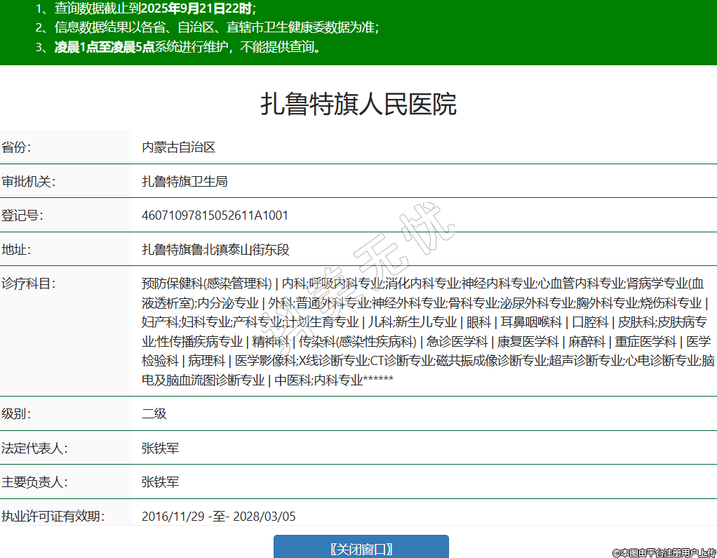 省份:內蒙古自治區(qū)審批機關:扎魯特旗衛(wèi)生局登記號:46071097815052611A1001地址:扎魯特旗魯北鎮(zhèn)泰山街東段診療科目:預防保健科(感染管理科) | 內科;呼吸內科專業(yè);消化內科專業(yè);神經內科專業(yè);心血管內科專業(yè);腎病學專業(yè)(血液透析室);內分泌專業(yè) | 外科;普通外科專業(yè);神經外科專業(yè);骨科專業(yè);泌尿外科專業(yè);胸外科專業(yè);燒傷科專業(yè) | 婦產科;婦科專業(yè);產科專業(yè);計劃生育專業(yè) | 兒科;新生兒專業(yè) | 眼科 | 耳鼻咽喉科 | 口腔科 | 皮膚科;皮膚病專業(yè);性傳播疾病專業(yè) | 精神科 | 傳染科(感染性疾病科) | 急診醫(yī)學科 | 康復醫(yī)學科 | 麻醉科 | 重癥醫(yī)學科 | 醫(yī)學檢驗科 | 病理科 | 醫(yī)學影像科;X線診斷專業(yè);CT診斷專業(yè);磁共振成像診斷專業(yè);超聲診斷專業(yè);心電診斷專業(yè);腦電及腦血流圖診斷專業(yè) | 中醫(yī)科;內科專業(yè)******級別:二級法定代表人:張鐵軍主要負責人:張鐵軍執(zhí)業(yè)許可證有效期:2016/11/29 -至- 2028/03/05 -
