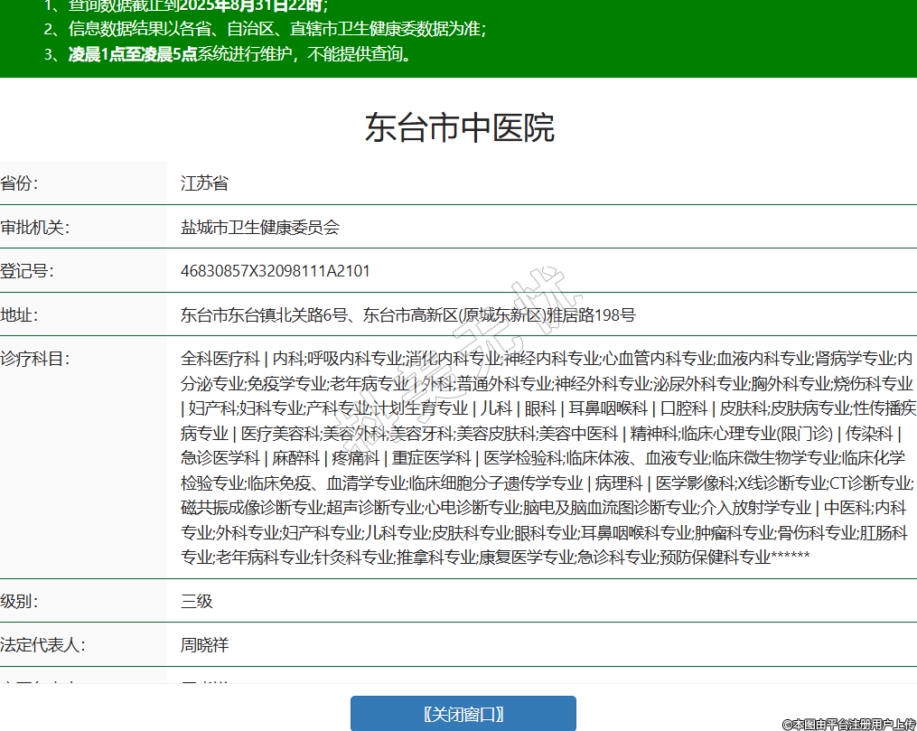 省份:江蘇省審批機(jī)關(guān):鹽城市衛(wèi)生健康委員會(huì)登記號(hào):46830857X32098111A2101地址:東臺(tái)市東臺(tái)鎮(zhèn)北關(guān)路6號(hào)、東臺(tái)市高新區(qū)(原城東新區(qū))雅居路198號(hào)診療科目:全科醫(yī)療科 | 內(nèi)科;呼吸內(nèi)科專業(yè);消化內(nèi)科專業(yè);神經(jīng)內(nèi)科專業(yè);心血管內(nèi)科專業(yè);血液內(nèi)科專業(yè);腎病學(xué)專業(yè);內(nèi)分泌專業(yè);免疫學(xué)專業(yè);老年病專業(yè) | 外科;普通外科專業(yè);神經(jīng)外科專業(yè);泌尿外科專業(yè);胸外科專業(yè);燒傷科專業(yè) | 婦產(chǎn)科;婦科專業(yè);產(chǎn)科專業(yè);計(jì)劃生育專業(yè) | 兒科 | 眼科 | 耳鼻咽喉科 | 口腔科 | 皮膚科;皮膚病專業(yè);性傳播疾病專業(yè) | 醫(yī)療美容科;美容外科;美容牙科;美容皮膚科;美容中醫(yī)科 | 精神科;臨床心理專業(yè)(限門診) | 傳染科 | 急診醫(yī)學(xué)科 | 麻醉科 | 疼痛科 | 重癥醫(yī)學(xué)科 | 醫(yī)學(xué)檢驗(yàn)科;臨床體液、血液專業(yè);臨床微生物學(xué)專業(yè);臨床化學(xué)檢驗(yàn)專業(yè);臨床免疫、血清學(xué)專業(yè);臨床細(xì)胞分子遺傳學(xué)專業(yè) | 病理科 | 醫(yī)學(xué)影像科;X線診斷專業(yè);CT診斷專業(yè);磁共振成像診斷專業(yè);超聲診斷專業(yè);心電診斷專業(yè);腦電及腦血流圖診斷專業(yè);介入放射學(xué)專業(yè) | 中醫(yī)科;內(nèi)科專業(yè);外科專業(yè);婦產(chǎn)科專業(yè);兒科專業(yè);皮膚科專業(yè);眼科專業(yè);耳鼻咽喉科專業(yè);腫瘤科專業(yè);骨傷科專業(yè);肛腸科專業(yè);老年病科專業(yè);針灸科專業(yè);推拿科專業(yè);康復(fù)醫(yī)學(xué)專業(yè);急診科專業(yè);預(yù)防保健科專業(yè)******級(jí)別:三級(jí)法定代表人:周曉祥主要負(fù)責(zé)人:周曉祥執(zhí)業(yè)許可證有效期:2020/04/23 -至- 2035/04/22 -