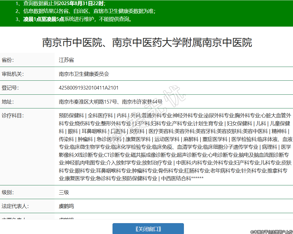 省份:江蘇省審批機(jī)關(guān):南京市衛(wèi)生健康委員會(huì)登記號(hào):42580091932010411A2101地址:南京市秦淮區(qū)大明路157號(hào)、南京市許家巷44號(hào)診療科目:預(yù)防保健科 | 全科醫(yī)療科 | 內(nèi)科 | 外科;普通外科專業(yè);神經(jīng)外科專業(yè);泌尿外科專業(yè);胸外科專業(yè);心臟大血管外科專業(yè);燒傷科專業(yè);整形外科專業(yè) | 婦產(chǎn)科;婦科專業(yè);產(chǎn)科專業(yè);計(jì)劃生育專業(yè) | 婦女保健科 | 兒科 | 兒童保健科 | 眼科 | 耳鼻咽喉科 | 口腔科 | 皮膚科 | 醫(yī)療美容科;美容外科;美容牙科;美容皮膚科;美容中醫(yī)科 | 精神科 | 傳染科 | 腫瘤科 | 急診醫(yī)學(xué)科 | 康復(fù)醫(yī)學(xué)科 | 運(yùn)動(dòng)醫(yī)學(xué)科 | 麻醉科 | 重癥醫(yī)學(xué)科 | 醫(yī)學(xué)檢驗(yàn)科;臨床體液、血液專業(yè);臨床微生物學(xué)專業(yè);臨床化學(xué)檢驗(yàn)專業(yè);臨床免疫、血清學(xué)專業(yè);臨床細(xì)胞分子遺傳學(xué)專業(yè) | 病理科 | 醫(yī)學(xué)影像科;X線診斷專業(yè);CT診斷專業(yè);磁共振成像診斷專業(yè);超聲診斷專業(yè);心電診斷專業(yè);腦電及腦血流圖診斷專業(yè);神經(jīng)肌肉電圖專業(yè);介入放射學(xué)專業(yè);放射治療專業(yè) | 中醫(yī)科;內(nèi)科專業(yè);外科專業(yè);婦產(chǎn)科專業(yè);兒科專業(yè);皮膚科專業(yè);眼科專業(yè);耳鼻咽喉科專業(yè);腫瘤科專業(yè);骨傷科專業(yè);肛腸科專業(yè);老年病科專業(yè);針灸科專業(yè);推拿科專業(yè);康復(fù)醫(yī)學(xué)專業(yè);急診科專業(yè);預(yù)防保健科專業(yè) | 中西醫(yī)結(jié)合科******級(jí)別:三級(jí)法定代表人:虞鶴鳴主要負(fù)責(zé)人:虞鶴鳴執(zhí)業(yè)許可證有效期:2025/02/12 -至- 2036/01/10 -
