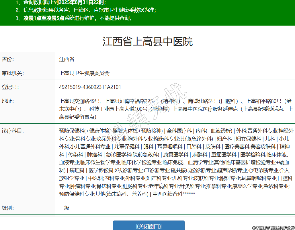 省份:江西省審批機(jī)關(guān):上高縣衛(wèi)生健康委員會(huì)登記號(hào):49215019-436092311A2101地址:上高縣交通路49號(hào)、上高縣河南幸福路225號(hào)(精神科)、商城北路5號(hào)(口腔科)、上高和平路80號(hào)(治未病中心)、科技工業(yè)園上高大道100號(hào)(感染樓)上高縣中醫(yī)院醫(yī)療服務(wù)延伸點(diǎn)(上高縣紀(jì)委談話點(diǎn)、上高縣紀(jì)委留置點(diǎn))診療科目:預(yù)防保健科(+健康體檢+駕駛?cè)梭w檢+預(yù)防接種) | 全科醫(yī)療科 | 內(nèi)科(+血液透析) | 外科;普通外科專業(yè);神經(jīng)外科專業(yè);骨科專業(yè);泌尿外科專業(yè);胸外科專業(yè);燒傷科專業(yè);其他(急診外科) | 婦產(chǎn)科 | 婦女保健科 | 兒科 | 小兒外科;小兒普通外科專業(yè) | 兒童保健科 | 眼科 | 耳鼻咽喉科 | 口腔科 | 皮膚科 | 醫(yī)療美容科;美容皮膚科 | 精神科 | 傳染科 | 腫瘤科 | 急診醫(yī)學(xué)科(院前急救科) | 康復(fù)醫(yī)學(xué)科 | 麻醉科 | 重癥醫(yī)學(xué)科 | 醫(yī)學(xué)檢驗(yàn)科;臨床體液、血液專業(yè);臨床微生物學(xué)專業(yè);臨床化學(xué)檢驗(yàn)專業(yè);臨床免疫、血清學(xué)專業(yè);其他(臨床基因擴(kuò)增檢驗(yàn)專業(yè)+輸血科) | 病理科 | 醫(yī)學(xué)影像科;X線診斷專業(yè);CT診斷專業(yè);磁共振成像診斷專業(yè);超聲診斷專業(yè);心電診斷專業(yè);介入放射學(xué)專業(yè) | 中醫(yī)科;內(nèi)科專業(yè);外科專業(yè);婦產(chǎn)科專業(yè);兒科專業(yè);皮膚科專業(yè);眼科專業(yè);耳鼻咽喉科專業(yè);口腔科專業(yè);腫瘤科專業(yè);骨傷科專業(yè);肛腸科專業(yè);老年病科專業(yè);針灸科專業(yè);推拿科專業(yè);康復(fù)醫(yī)學(xué)專業(yè);急診科專業(yè);預(yù)防保健科專業(yè);其他(治未病科、營(yíng)養(yǎng)科) | 中西醫(yī)結(jié)合科******級(jí)別:三級(jí)法定代表人:周榮主要負(fù)責(zé)人:周建平執(zhí)業(yè)許可證有效期:2022/11/02 -至- 2027/11/01 -