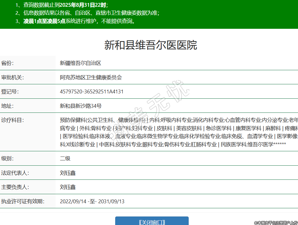 省份:新疆維吾爾自治區(qū)審批機(jī)關(guān):阿克蘇地區(qū)衛(wèi)生健康委員會(huì)登記號(hào):45797520-365292511A4131地址:新和縣新沙路34號(hào)診療科目:預(yù)防保健科(公共衛(wèi)生科、健康體檢科) | 內(nèi)科;呼吸內(nèi)科專業(yè);消化內(nèi)科專業(yè);心血管內(nèi)科專業(yè);內(nèi)分泌專業(yè);老年病專業(yè) | 外科;骨科專業(yè) | 婦產(chǎn)科;婦科專業(yè) | 皮膚科 | 美容皮膚科 | 急診醫(yī)學(xué)科 | 康復(fù)醫(yī)學(xué)科 | 麻醉科 | 疼痛科 | 醫(yī)學(xué)檢驗(yàn)科;臨床體液、血液專業(yè);臨床微生物學(xué)專業(yè);臨床化學(xué)檢驗(yàn)專業(yè);臨床免疫、血清學(xué)專業(yè) | 醫(yī)學(xué)影像科;X線診斷專業(yè) | 中醫(yī)科;皮膚科專業(yè);眼科專業(yè);骨傷科專業(yè);肛腸科專業(yè) | 民族醫(yī)學(xué)科;維吾爾醫(yī)學(xué)******級(jí)別:二級(jí)法定代表人:劉鈺鑫主要負(fù)責(zé)人:劉鈺鑫執(zhí)業(yè)許可證有效期:2022/09/14 -至- 2031/09/13 -