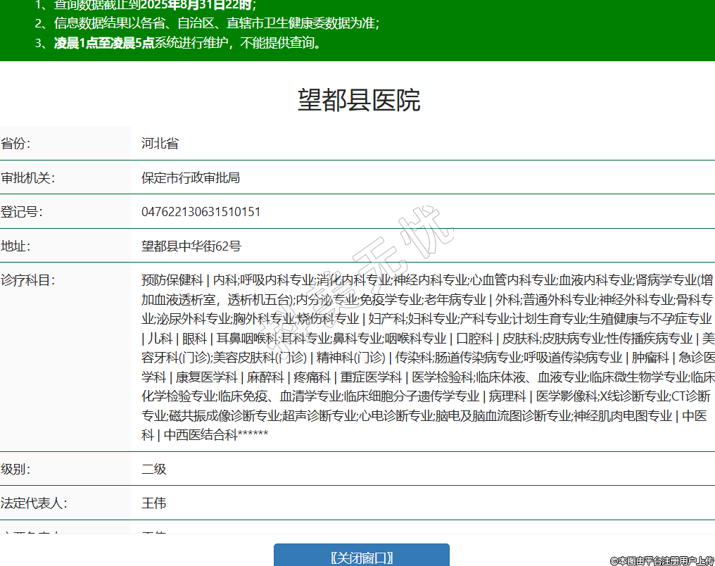 省份:河北省審批機關(guān):保定市行政審批局登記號:047622130631510151地址:望都縣中華街62號診療科目:預(yù)防保健科 | 內(nèi)科;呼吸內(nèi)科專業(yè);消化內(nèi)科專業(yè);神經(jīng)內(nèi)科專業(yè);心血管內(nèi)科專業(yè);血液內(nèi)科專業(yè);腎病學(xué)專業(yè)(增加血液透析室,透析機五臺);內(nèi)分泌專業(yè);免疫學(xué)專業(yè);老年病專業(yè) | 外科;普通外科專業(yè);神經(jīng)外科專業(yè);骨科專業(yè);泌尿外科專業(yè);胸外科專業(yè);燒傷科專業(yè) | 婦產(chǎn)科;婦科專業(yè);產(chǎn)科專業(yè);計劃生育專業(yè);生殖健康與不孕癥專業(yè) | 兒科 | 眼科 | 耳鼻咽喉科;耳科專業(yè);鼻科專業(yè);咽喉科專業(yè) | 口腔科 | 皮膚科;皮膚病專業(yè);性傳播疾病專業(yè) | 美容牙科(門診);美容皮膚科(門診) | 精神科(門診) | 傳染科;腸道傳染病專業(yè);呼吸道傳染病專業(yè) | 腫瘤科 | 急診醫(yī)學(xué)科 | 康復(fù)醫(yī)學(xué)科 | 麻醉科 | 疼痛科 | 重癥醫(yī)學(xué)科 | 醫(yī)學(xué)檢驗科;臨床體液、血液專業(yè);臨床微生物學(xué)專業(yè);臨床化學(xué)檢驗專業(yè);臨床免疫、血清學(xué)專業(yè);臨床細(xì)胞分子遺傳學(xué)專業(yè) | 病理科 | 醫(yī)學(xué)影像科;X線診斷專業(yè);CT診斷專業(yè);磁共振成像診斷專業(yè);超聲診斷專業(yè);心電診斷專業(yè);腦電及腦血流圖診斷專業(yè);神經(jīng)肌肉電圖專業(yè) | 中醫(yī)科 | 中西醫(yī)結(jié)合科******級別:二級法定代表人:王偉主要負(fù)責(zé)人:王偉執(zhí)業(yè)許可證有效期:2023/07/01 -至- 2038/06/30 -