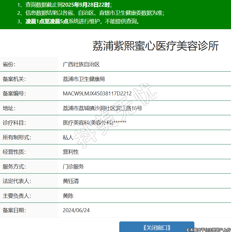 省份:廣西壯族自治區(qū)備案機關(guān):荔浦市衛(wèi)生健康局備案編號:MACW9LMJX45038117D2212地址:荔浦市荔城鎮(zhèn)沙洞社區(qū)濱江路16號診療科目:醫(yī)療美容科(美容外科)******所有制形式:私人經(jīng)營性質(zhì):營利性服務(wù)方式:門診服務(wù)法定代表人:黃鈺清主要負責人:黃陳備案日期:2024/06/24 -
