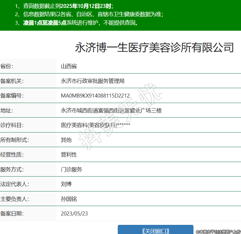 省份:山西省備案機(jī)關(guān):永濟(jì)市行政審批服務(wù)管理局備案編號(hào):MA0MB9KX914088115D2212地址:永濟(jì)市城西街道富強(qiáng)西街遠(yuǎn)景置業(yè)廣場(chǎng)三樓診療科目:醫(yī)療美容科(美容皮膚科)******所有制形式:其他經(jīng)營(yíng)性質(zhì):營(yíng)利性服務(wù)方式:門(mén)診服務(wù)法定代表人:劉博主要負(fù)責(zé)人:孫國(guó)銘備案日期:2023/05/23 -
