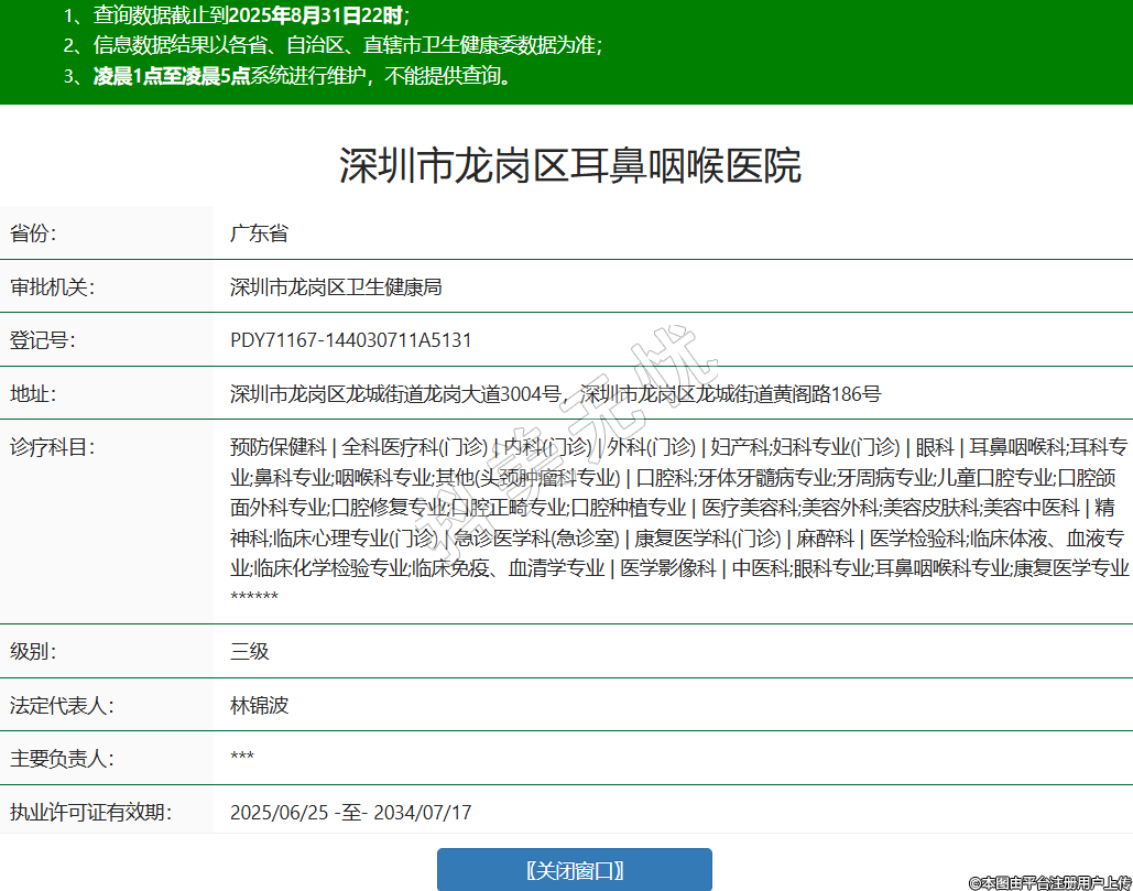 省份:廣東省審批機關:深圳市龍崗區(qū)衛(wèi)生健康局登記號:PDY71167-144030711A5131地址:深圳市龍崗區(qū)龍城街道龍崗大道3004號,深圳市龍崗區(qū)龍城街道黃閣路186號診療科目:預防保健科 | 全科醫(yī)療科(門診) | 內科(門診) | 外科(門診) | 婦產科;婦科專業(yè)(門診) | 眼科 | 耳鼻咽喉科;耳科專業(yè);鼻科專業(yè);咽喉科專業(yè);其他(頭頸腫瘤科專業(yè)) | 口腔科;牙體牙髓病專業(yè);牙周病專業(yè);兒童口腔專業(yè);口腔頜面外科專業(yè);口腔修復專業(yè);口腔正畸專業(yè);口腔種植專業(yè) | 醫(yī)療美容科;美容外科;美容皮膚科;美容中醫(yī)科 | 精神科;臨床心理專業(yè)(門診) | 急診醫(yī)學科(急診室) | 康復醫(yī)學科(門診) | 麻醉科 | 醫(yī)學檢驗科;臨床體液、血液專業(yè);臨床化學檢驗專業(yè);臨床免疫、血清學專業(yè) | 醫(yī)學影像科 | 中醫(yī)科;眼科專業(yè);耳鼻咽喉科專業(yè);康復醫(yī)學專業(yè)******級別:三級法定代表人:林錦波主要負責人:***執(zhí)業(yè)許可證有效期:2025/06/25 -至- 2034/07/17 -
