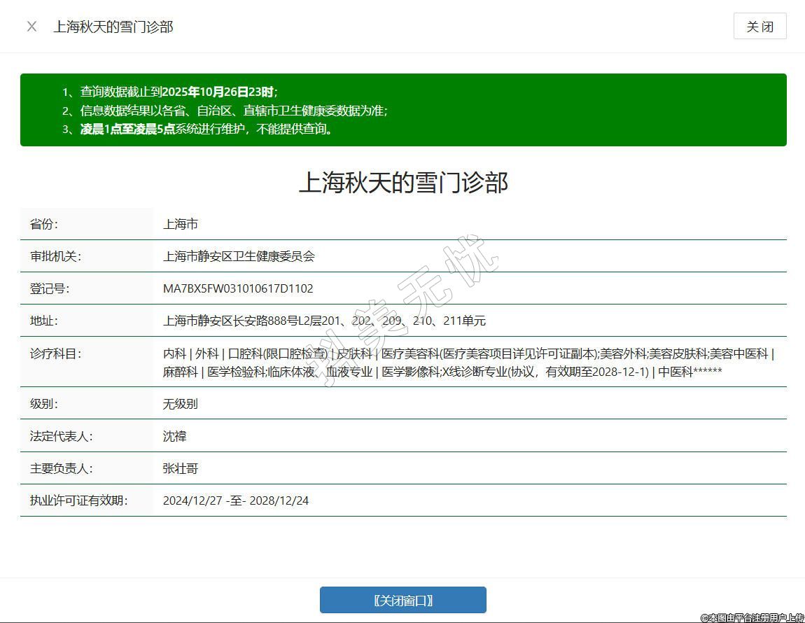 內(nèi)科 | 外科 | 口腔科(限口腔檢查) | 皮膚科 | 醫(yī)療美容科(醫(yī)療美容項(xiàng)目詳見許可證副本);美容外科;美容皮膚科;美容中醫(yī)科 | 麻醉科 | 醫(yī)學(xué)檢驗(yàn)科;臨床體液、血液專業(yè) | 醫(yī)學(xué)影像科;X線診斷專業(yè)(協(xié)議,有效期至2028-12-1) | 中醫(yī)科******