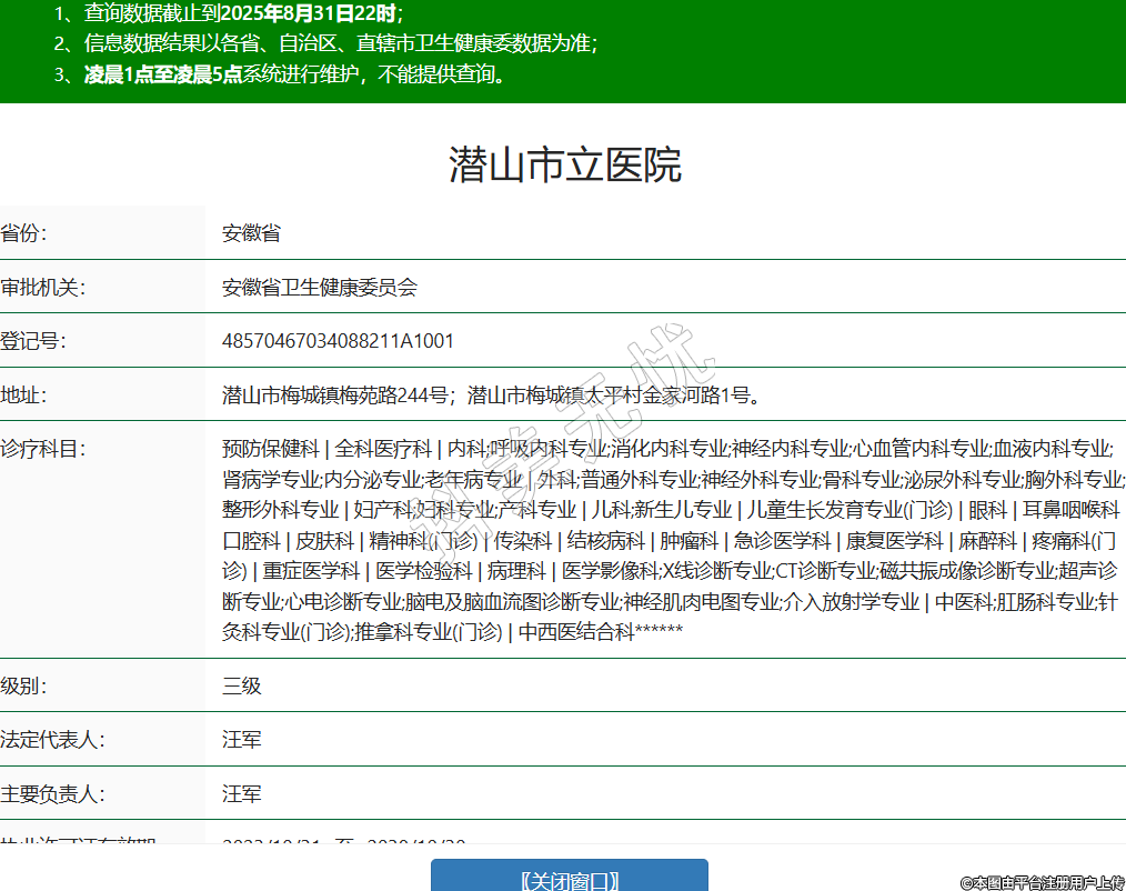 省份:安徽省審批機關:安徽省衛(wèi)生健康委員會登記號:48570467034088211A1001地址:潛山市梅城鎮(zhèn)梅苑路244號;潛山市梅城鎮(zhèn)太平村金家河路1號。診療科目:預防保健科 | 全科醫(yī)療科 | 內科;呼吸內科專業(yè);消化內科專業(yè);神經內科專業(yè);心血管內科專業(yè);血液內科專業(yè);腎病學專業(yè);內分泌專業(yè);老年病專業(yè) | 外科;普通外科專業(yè);神經外科專業(yè);骨科專業(yè);泌尿外科專業(yè);胸外科專業(yè);整形外科專業(yè) | 婦產科;婦科專業(yè);產科專業(yè) | 兒科;新生兒專業(yè) | 兒童生長發(fā)育專業(yè)(門診) | 眼科 | 耳鼻咽喉科 | 口腔科 | 皮膚科 | 精神科(門診) | 傳染科 | 結核病科 | 腫瘤科 | 急診醫(yī)學科 | 康復醫(yī)學科 | 麻醉科 | 疼痛科(門診) | 重癥醫(yī)學科 | 醫(yī)學檢驗科 | 病理科 | 醫(yī)學影像科;X線診斷專業(yè);CT診斷專業(yè);磁共振成像診斷專業(yè);超聲診斷專業(yè);心電診斷專業(yè);腦電及腦血流圖診斷專業(yè);神經肌肉電圖專業(yè);介入放射學專業(yè) | 中醫(yī)科;肛腸科專業(yè);針灸科專業(yè)(門診);推拿科專業(yè)(門診) | 中西醫(yī)結合科******級別:三級法定代表人:汪軍主要負責人:汪軍執(zhí)業(yè)許可證有效期:2023/10/31 -至- 2038/10/30 -