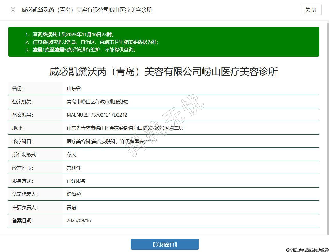 青島威必凱黛沃芮醫(yī)療美容診所成立于2025年,位于山東省青島市嶗山區(qū)金家?guī)X街道??诼?3-20號(hào)網(wǎng)點(diǎn)二層,是經(jīng)衛(wèi)生行政部門登記注冊(cè)、持有《醫(yī)療機(jī)構(gòu)執(zhí)業(yè)許可證》的合規(guī)醫(yī)療美容機(jī)構(gòu),醫(yī)師團(tuán)隊(duì)均具備執(zhí)業(yè)醫(yī)師資格,所有醫(yī)療設(shè)備定期維護(hù)校準(zhǔn),藥品從正規(guī)渠道采購(gòu)并建立完善追溯體系,堅(jiān)守醫(yī)療本質(zhì),以規(guī)范診療為核心,致力于在合規(guī)前提下滿足顧客的合理美容需求。