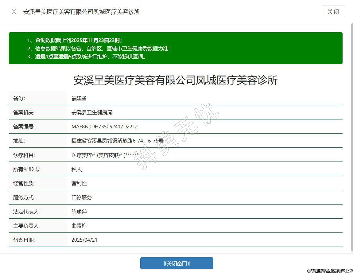 安溪呈美醫(yī)療美容診所成立于2024年,位于福建省安溪縣鳳城鎮(zhèn)解放路6-74、6-75號,是經(jīng)相關(guān)部門批準(zhǔn)設(shè)立的正規(guī)醫(yī)療美容機構(gòu),專注為顧客提供合規(guī)專業(yè)的醫(yī)療美容服務(wù),經(jīng)營范圍涵蓋醫(yī)療美容服務(wù)、生活美容服務(wù)、健康咨詢服務(wù)等許可及一般項目,配備具備專業(yè)資質(zhì)的醫(yī)護團隊,提供術(shù)前咨詢、術(shù)中規(guī)范操作、術(shù)后護理指導(dǎo)的全流程服務(wù),致力于打造安全、放心的醫(yī)療美容體驗。
