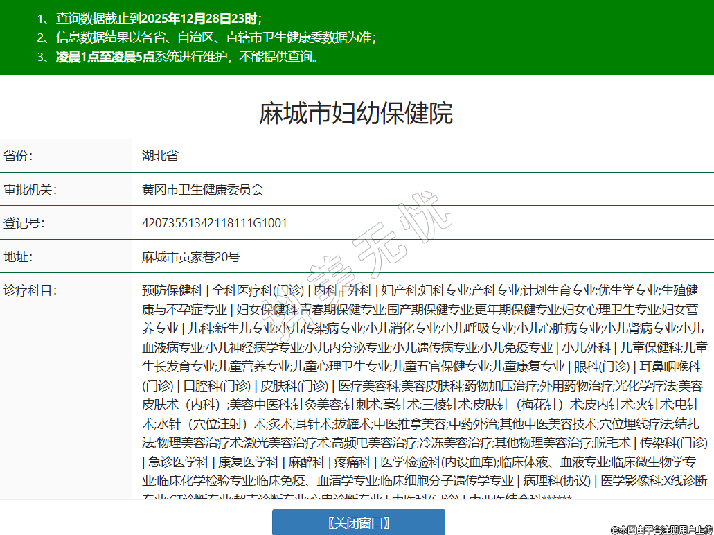 省份:湖北省審批機關(guān):黃岡市衛(wèi)生健康委員會登記號:42073551342118111G1001地址:麻城市貢家巷20號診療科目:預防保健科 | 全科醫(yī)療科(門診) | 內(nèi)科 | 外科 | 婦產(chǎn)科;婦科專業(yè);產(chǎn)科專業(yè);計劃生育專業(yè);優(yōu)生學專業(yè);生殖健康與不孕癥專業(yè) | 婦女保健科;青春期保健專業(yè);圍產(chǎn)期保健專業(yè);更年期保健專業(yè);婦女心理衛(wèi)生專業(yè);婦女營養(yǎng)專業(yè) | 兒科;新生兒專業(yè);小兒傳染病專業(yè);小兒消化專業(yè);小兒呼吸專業(yè);小兒心臟病專業(yè);小兒腎病專業(yè);小兒血液病專業(yè);小兒神經(jīng)病學專業(yè);小兒內(nèi)分泌專業(yè);小兒遺傳病專業(yè);小兒免疫專業(yè) | 小兒外科 | 兒童保健科;兒童生長發(fā)育專業(yè);兒童營養(yǎng)專業(yè);兒童心理衛(wèi)生專業(yè);兒童五官保健專業(yè);兒童康復專業(yè) | 眼科(門診) | 耳鼻咽喉科(門診) | 口腔科(門診) | 皮膚科(門診) | 醫(yī)療美容科;美容皮膚科;藥物加壓治療;外用藥物治療;光化學療法;美容皮膚術(shù)(內(nèi)科);美容中醫(yī)科;針灸美容;針刺術(shù);毫針術(shù);三棱針術(shù);皮膚針(梅花針)術(shù);皮內(nèi)針術(shù);火針術(shù);電針術(shù);水針(穴位注射)術(shù);炙術(shù);耳針術(shù);拔罐術(shù);中醫(yī)推拿美容;中藥外治;其他中醫(yī)美容技術(shù);穴位埋線療法;結(jié)扎法;物理美容治療術(shù);激光美容治療術(shù);高頻電美容治療;冷凍美容治療;其他物理美容治療;脫毛術(shù) | 傳染科(門診) | 急診醫(yī)學科 | 康復醫(yī)學科 | 麻醉科 | 疼痛科 | 醫(yī)學檢驗科(內(nèi)設血庫);臨床體液、血液專業(yè);臨床微生物學專業(yè);臨床化學檢驗專業(yè);臨床免疫、血清學專業(yè);臨床細胞分子遺傳學專業(yè) | 病理科(協(xié)議) | 醫(yī)學影像科;X線診斷專業(yè);CT診斷專業(yè);超聲診斷專業(yè);心電診斷專業(yè) | 中醫(yī)科(門診) | 中西醫(yī)結(jié)合科******級別:三級法定代表人:李靜主要負責人:李靜執(zhí)業(yè)許可證有效期:2025/12/12 -至- 2037/11/02 -