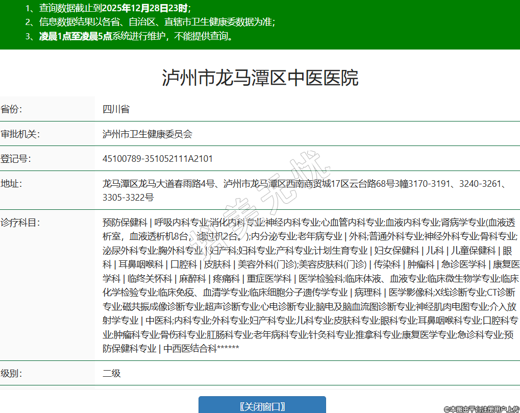 省份:四川省審批機關(guān):瀘州市衛(wèi)生健康委員會登記號:45100789-351052111A2101地址:龍馬潭區(qū)龍馬大道春雨路4號、瀘州市龍馬潭區(qū)西南商貿(mào)城17區(qū)云臺路68號3幢3170-3191、3240-3261、3305-3322號診療科目:預(yù)防保健科 | 呼吸內(nèi)科專業(yè);消化內(nèi)科專業(yè);神經(jīng)內(nèi)科專業(yè);心血管內(nèi)科專業(yè);血液內(nèi)科專業(yè);腎病學(xué)專業(yè)(血液透析室,血液透析機8臺,濾過機2臺。);內(nèi)分泌專業(yè);老年病專業(yè) | 外科;普通外科專業(yè);神經(jīng)外科專業(yè);骨科專業(yè);泌尿外科專業(yè);胸外科專業(yè) | 婦產(chǎn)科;婦科專業(yè);產(chǎn)科專業(yè);計劃生育專業(yè) | 婦女保健科 | 兒科 | 兒童保健科 | 眼科 | 耳鼻咽喉科 | 口腔科 | 皮膚科 | 美容外科(門診);美容皮膚科(門診) | 傳染科 | 腫瘤科 | 急診醫(yī)學(xué)科 | 康復(fù)醫(yī)學(xué)科 | 臨終關(guān)懷科 | 麻醉科 | 疼痛科 | 重癥醫(yī)學(xué)科 | 醫(yī)學(xué)檢驗科;臨床體液、血液專業(yè);臨床微生物學(xué)專業(yè);臨床化學(xué)檢驗專業(yè);臨床免疫、血清學(xué)專業(yè);臨床細(xì)胞分子遺傳學(xué)專業(yè) | 病理科 | 醫(yī)學(xué)影像科;X線診斷專業(yè);CT診斷專業(yè);磁共振成像診斷專業(yè);超聲診斷專業(yè);心電診斷專業(yè);腦電及腦血流圖診斷專業(yè);神經(jīng)肌肉電圖專業(yè);介入放射學(xué)專業(yè) | 中醫(yī)科;內(nèi)科專業(yè);外科專業(yè);婦產(chǎn)科專業(yè);兒科專業(yè);皮膚科專業(yè);眼科專業(yè);耳鼻咽喉科專業(yè);口腔科專業(yè);腫瘤科專業(yè);骨傷科專業(yè);肛腸科專業(yè);老年病科專業(yè);針灸科專業(yè);推拿科專業(yè);康復(fù)醫(yī)學(xué)專業(yè);急診科專業(yè);預(yù)防保健科專業(yè) | 中西醫(yī)結(jié)合科******級別:二級法定代表人:劉昌勇主要負(fù)責(zé)人:劉昌勇執(zhí)業(yè)許可證有效期:2021/12/31 -至- 2030/12/31 -