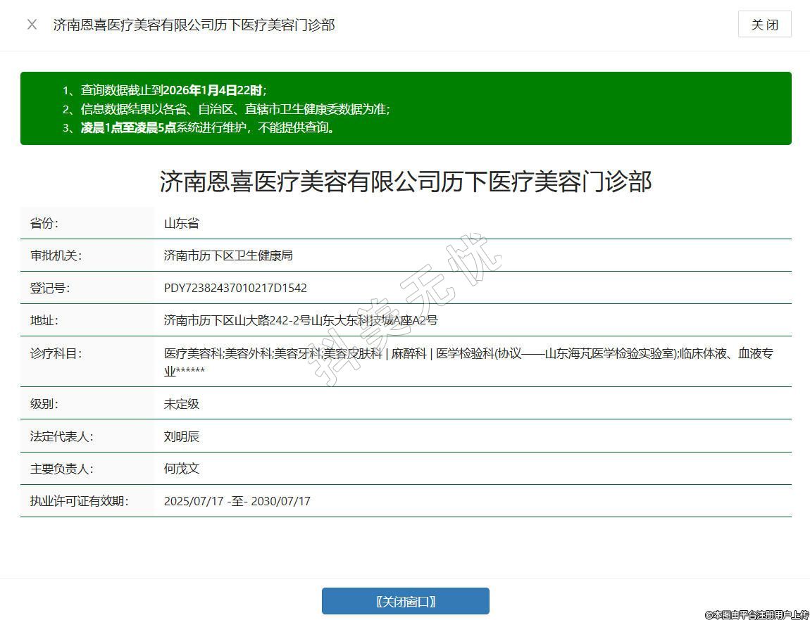 濟南恩喜醫(yī)療美容門診部成立于2020年,位于山東省濟南市歷下區(qū)山大路242-2號山東大東科技城A座A2號,是擁有合法資質(zhì)的專業(yè)醫(yī)美機構(gòu),作為全國連鎖醫(yī)美品牌旗下機構(gòu),配備標準化無菌層流手術(shù)室與溫馨私密的咨詢空間,業(yè)務(wù)涵蓋眼鼻精雕、皮膚美容、形體雕塑等多個領(lǐng)域,嚴格遵循醫(yī)療規(guī)范,所用藥品器械來源可溯。